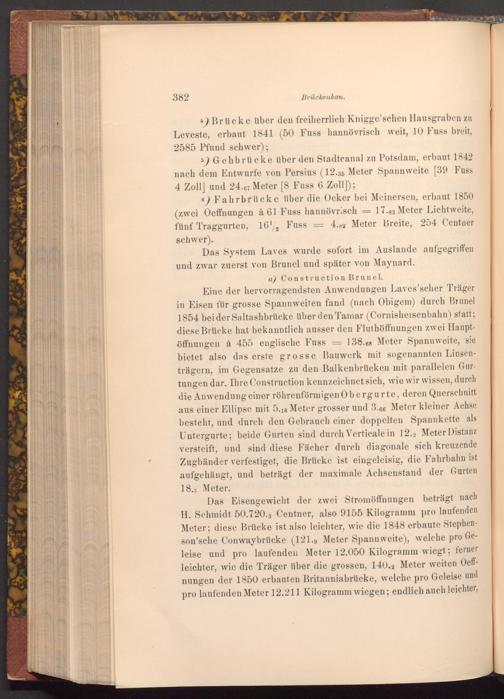 Eine der hervorragendsten Anwendungen Laves'scher Träger in Eisen für grosse Spannweiten fand( nach Obigem) durch Brunel 1854 bei der Saltashbrücke über den Tamar( Cornisheisenbahn) statt; diese Brücke hat bekanntlich ausser den Fluthöffnungen zwei Hauptöffnungen à 455 englische Fuss 138.68 Meter Spannweite, sie bietet also das erste grosse Bauwerk mit sogenannten Linsenträgern, im Gegensatze zu den Balkenbrücken mit parallelen Gurtungen dar. Ihre Construction kennzeichnet sich, wie wir wissen, durch die Anwendung einer röhrenförmigen Obergurte, deren Querschnitt aus einer Ellipse mit 5.18 Meter grosser und 3.66 Meter kleiner Achse besteht, und durch den Gebrauch einer doppelten Spannkette als Untergurte; beide Gurten sind durch Verticale in 12.2 Meter Distanz versteift, und sind diese Fächer durch diagonale sich kreuzende Zugbänder verfestiget, die Brücke ist eingeleisig, die Fahrbahn ist aufgehängt, und beträgt der maximale Achsenstand der Gurten 18. Meter.