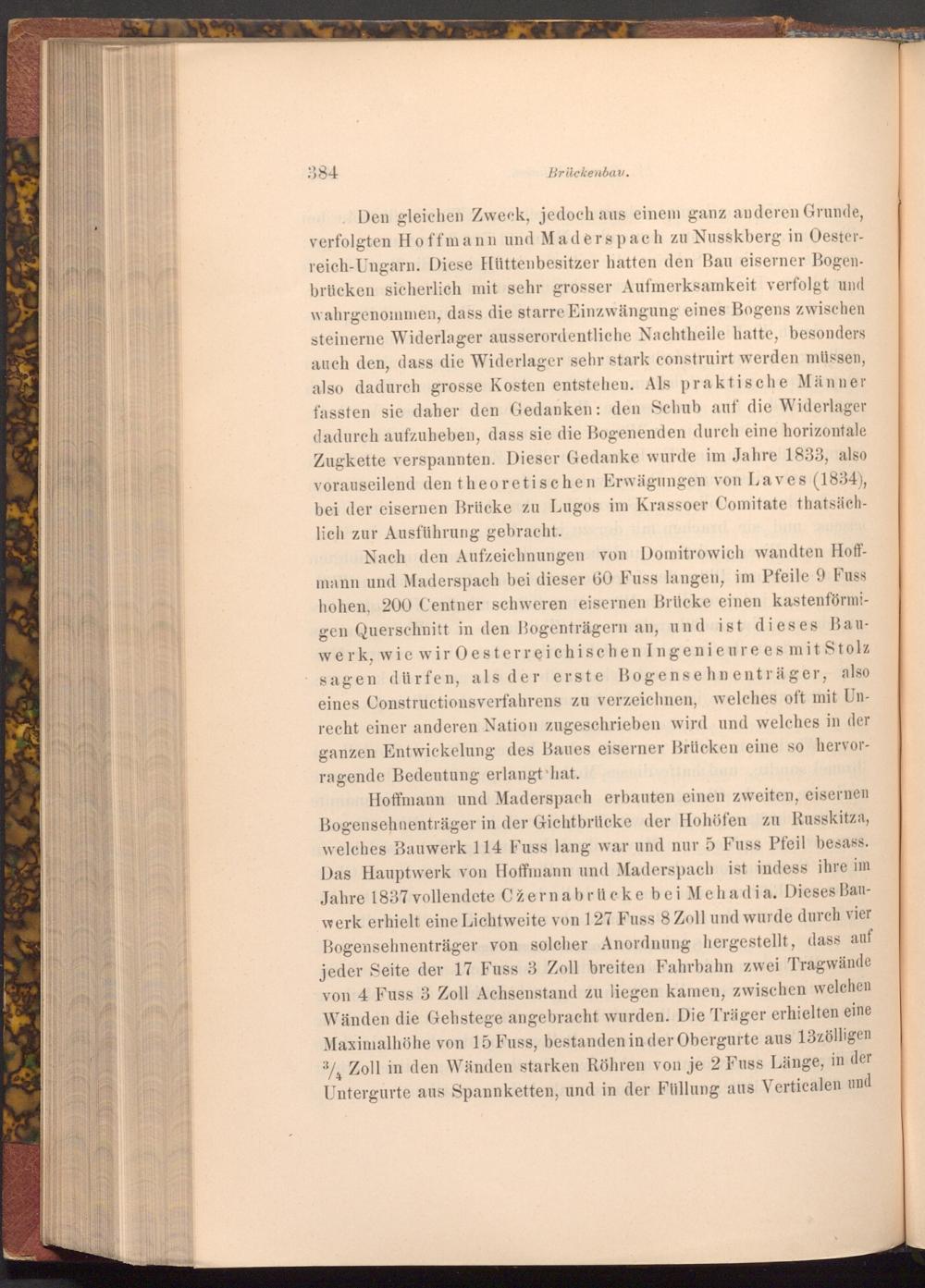 ind. Den gleichen Zweck, jedoch aus einem ganz anderen Grunde, verfolgten Hoffmann und Maderspach zu Nusskberg in Oesterreich- Ungarn. Diese Hüttenbesitzer hatten den Bau eiserner Bogenbrücken sicherlich mit sehr grosser Aufmerksamkeit verfolgt und wahrgenommen, dass die starre Einzwängung eines Bogens zwischen steinerne Widerlager ausserordentliche Nachtheile hatte, besonders auch den, dass die Widerlager sehr stark construirt werden müssen, also dadurch grosse Kosten entstehen. Als praktische Männer fassten sie daher den Gedanken: den Schub auf die Widerlager dadurch aufzuheben, dass sie die Bogenenden durch eine horizontale Zugkette verspannten. Dieser Gedanke wurde im Jahre 1833, also vorauseilend den theoretischen Erwägungen von Laves( 1834), bei der eisernen Brücke zu Lugos im Krassoer Comitate thatsächlich zur Ausführung gebracht.
