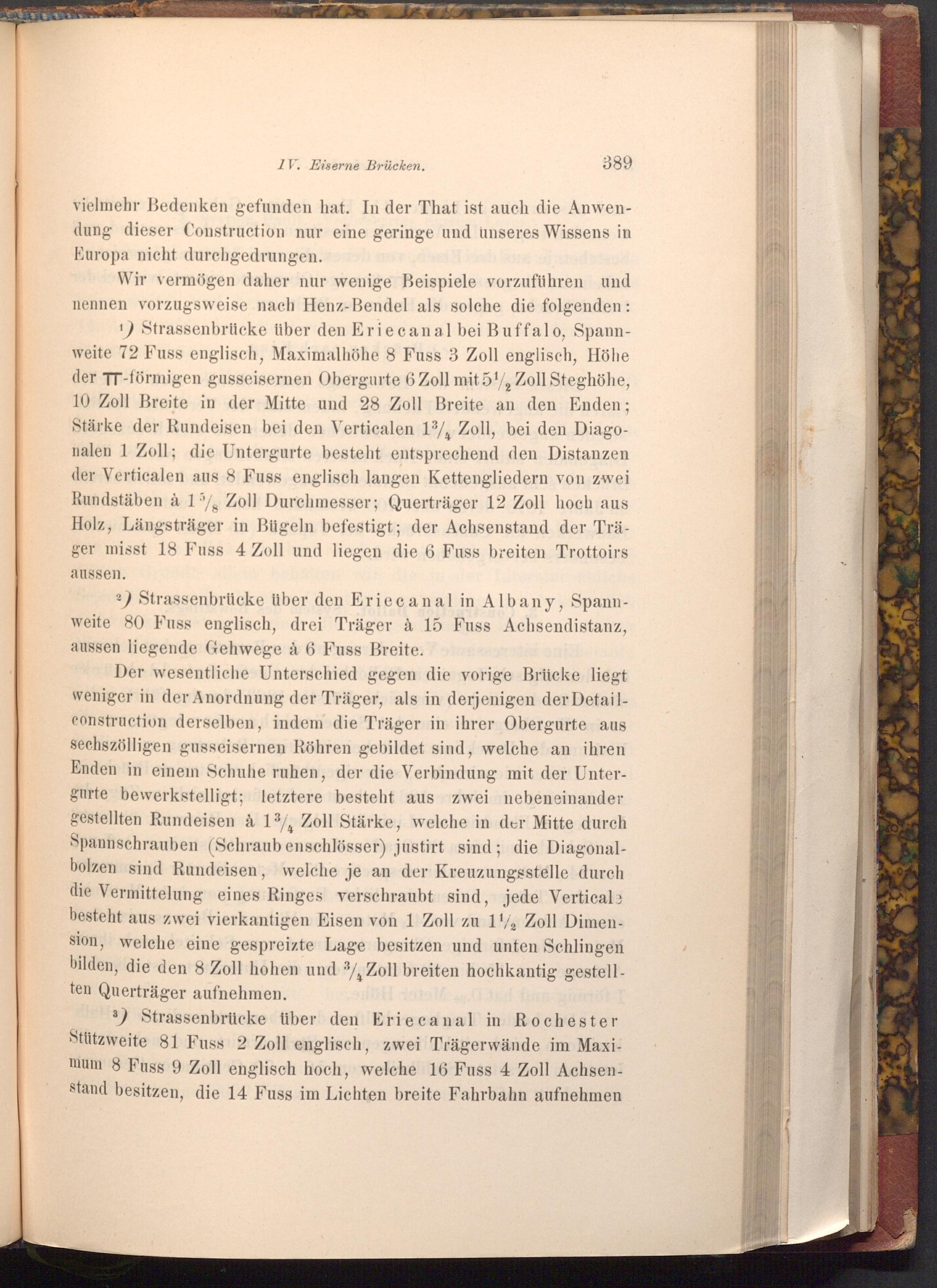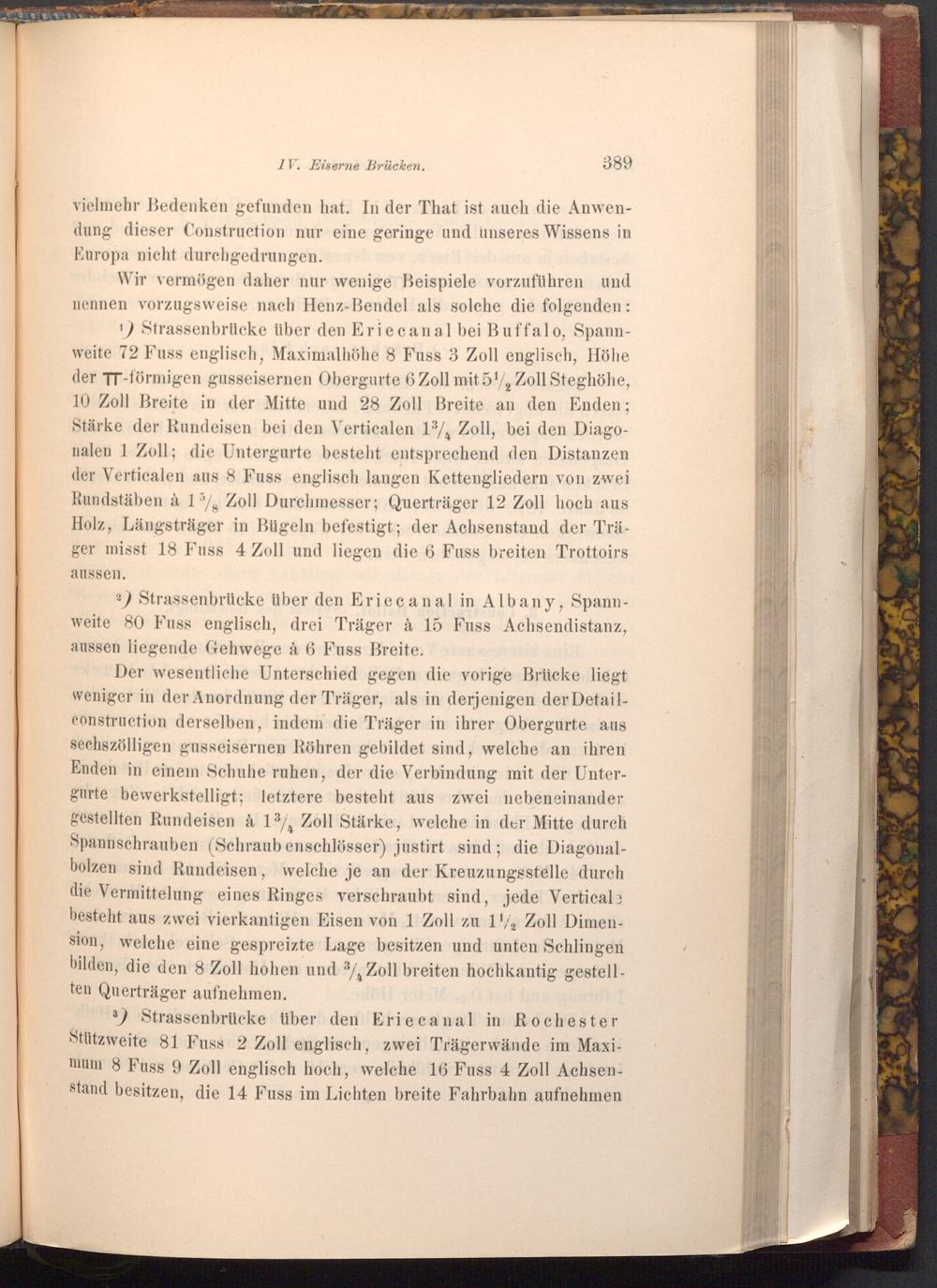 Wir vermögen daher nur wenige Beispiele vorzuführen und nennen vorzugsweise nach Henz- Bendel als solche die folgenden: 1) Strassenbrücke über den Erie canal bei Buffalo, Spannweite 72 Fuss englisch, Maximalhöhe 8 Fuss 3 Zoll englisch, Höhe der TT- förmigen gusseisernen Obergurte 6 Zoll mit 51, Zoll Steghöhe, 10 Zoll Breite in der Mitte und 28 Zoll Breite an den Enden; Stärke der Rundeisen bei den Verticalen 13, Zoll, bei den Diagonalen 1 Zoll; die Untergurte besteht entsprechend den Distanzen der Verticalen aus 8 Fuss englisch langen Kettengliedern von zwei Rundstäben à 15%, Zoll Durchmesser; Querträger 12 Zoll hoch aus Holz, Längsträger in Bügeln befestigt; der Achsenstand der Träger misst 18 Fuss 4 Zoll und liegen die 6 Fuss breiten Trottoirs
