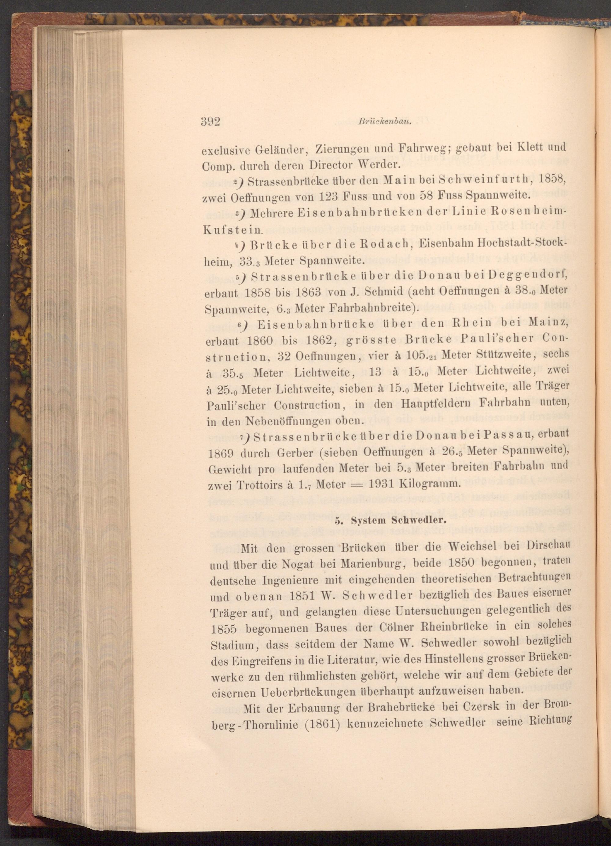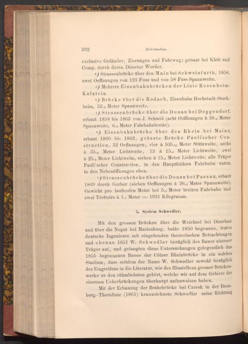Mit den grossen Brücken über die Weichsel bei Dirschau und über die Nogat bei Marienburg, beide 1850 begonnen, traten deutsche Ingenieure mit eingehenden theoretischen Betrachtungen und oben an 1851 W. Schwedler bezüglich des Baues eiserner Träger auf, und gelangten diese Untersuchungen gelegentlich des 1855 begonnenen Baues der Cölner Rheinbrücke in ein solches Stadium, dass seitdem der Name W. Schwedler sowohl bezüglich des Eingreifens in die Literatur, wie des Hinstellens grosser Brückenwerke zu den rühmlichsten gehört, welche wir auf dem Gebiete der eisernen Ueberbrückungen überhaupt aufzuweisen haben.