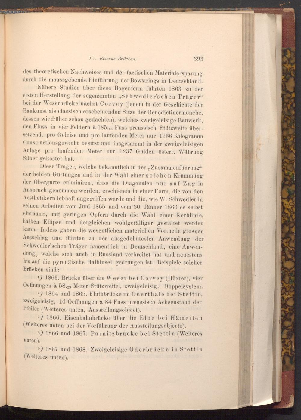 Nähere Studien über diese Bogenform führten 1863 zu der ersten Herstellung der sogenannten„, Schwedler'schen Träger" bei der Weserbrücke nächst Corvey( jenem in der Geschichte der Baukunst als classisch erscheinenden Sitze der Benedictinermönche, dessen wir früher schon gedachten), welches zweigeleisige Bauwerk, den Fluss in vier Feldern à 185.64 Fuss preussisch Stützweite übersetzend, pro Geleise und pro laufenden Meter nur 1766 Kilogramm Constructionsgewicht besitzt und insgesammt in der zweigeleisigen Anlage pro laufenden Meter nur 1237 Gulden österr. Währung Silber gekostet hat.
