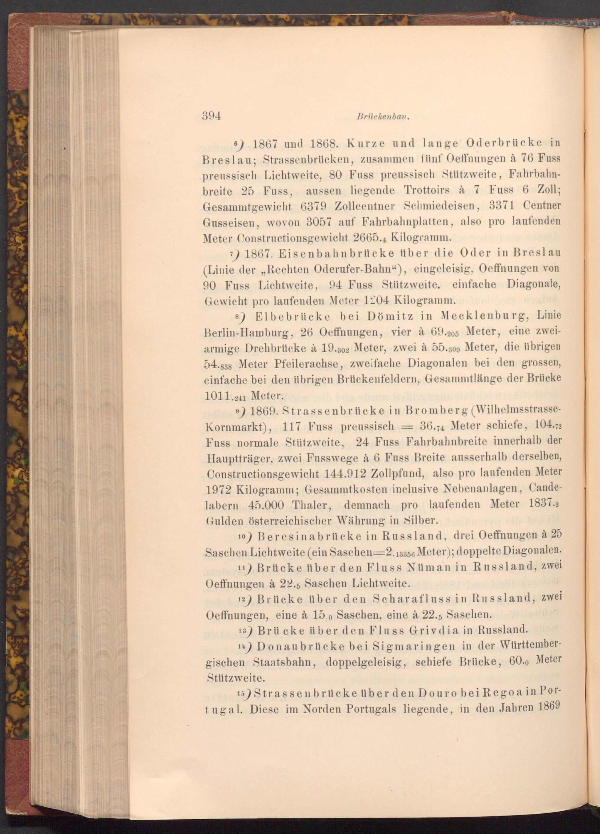 6) 1867 und 1868. Kurze und lange Oderbrücke in Breslau; Strassenbrücken, zusammen fünf Oeffnungen à 76 Fuss preussisch Lichtweite, 80 Fuss preussisch Stützweite, Fahrbahnbreite 25 Fuss, aussen liegende Trottoirs à 7 Fuss 6 Zoll; Gesammtgewicht 6379 Zollcentner Schmiedeisen, 3371 Centner Gusseisen, wovon 3057 auf Fahrbahnplatten, also pro laufenden Meter Constructionsgewicht 2665.4 Kilogramm.