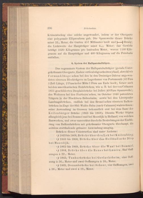 Das sogenannte System der Halbparabelträger( gerade Untergekrümmte Obergurte, Enden vertical abgeschnitten) fand, obwohl wir Formanklänge schon bei den in den Dreissiger Jahren angewendeten eisernen Blechträgern im Lagerhause von Portsmouth( 41 Fuss 3 Zoll Länge, 2 Fuss in der Mitte 1 Fuss am Ende hoch), ferner auch bei den amerikanischen Holzbrücken, wie z. B. bei der von Culmann 1851 geschilderten Desplainbrücke bei Joliet( 49 Fuss Spannweite), des Weiteren bei den Fairbairn'schen, im October 1846 patentirten Trägern in der Blackburn- Boltenbahn, sowie bei den Liverpooler Landungsbrücken, endlich bei den Brunel'schen eisernen Balkenbrücken im Zuge der Süd- Wales- Bahn( nach Culmann) wahrnehmen: seine Anwendung im Grossen bekanntlich erst bei dem Baue der Kuilenburger Brücke( 1863 bis 1868). Diesem Werke folgten allsogleich jene bei Bommel und bei Moerdijk in Holland, von welchen Bauwerken, und zwar unterstützt durch die Bestrebungen der Einführung von Balkenbrücken mit gekrümmter Obergurte überhaupt, die seitdem stattfindende grössere Anwendung ausging.