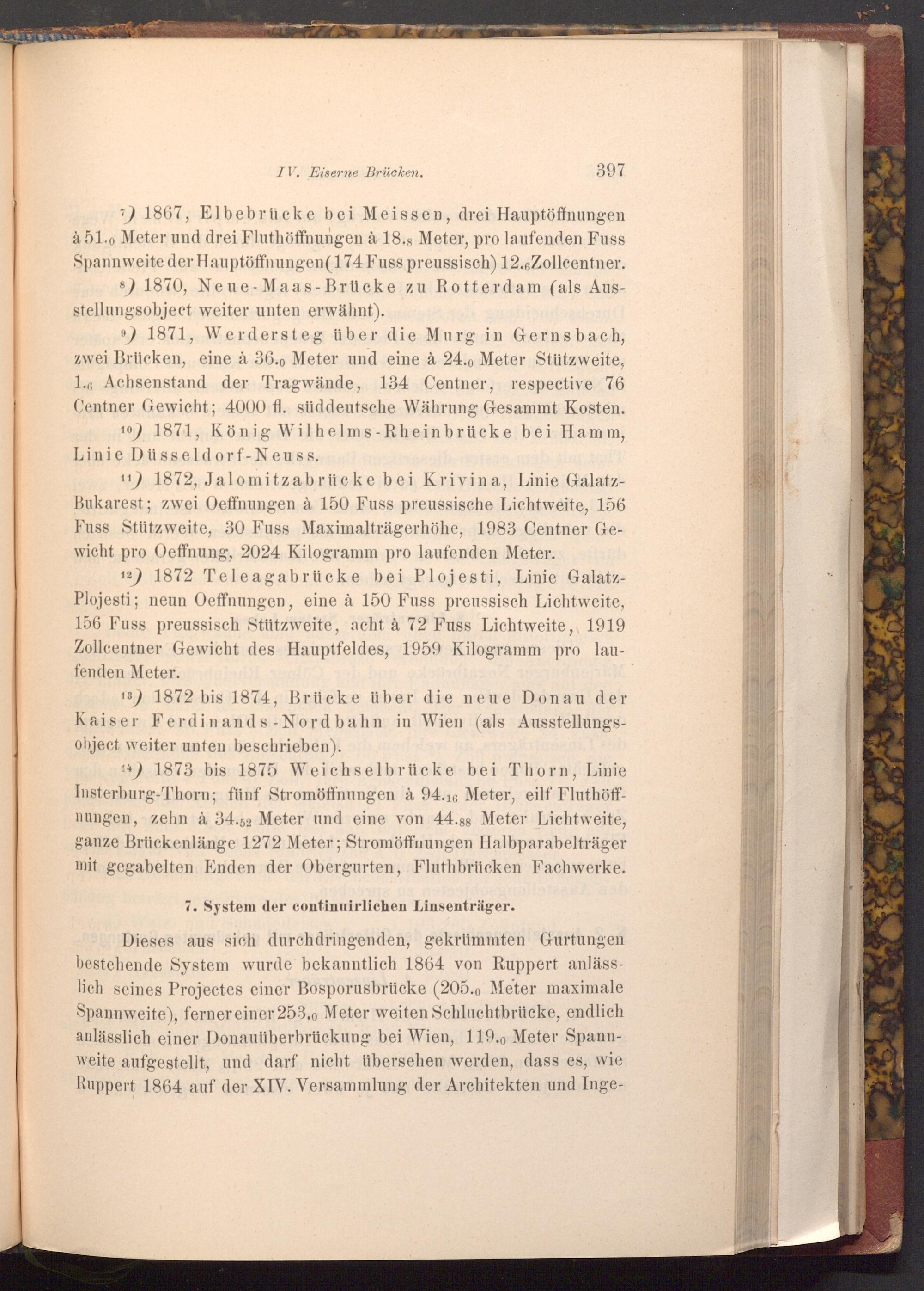 11) 1872, Jalomitzabrücke bei Krivina, Linie GalatzBukarest; zwei Oeffnungen à 150 Fuss preussische Lichtweite, 156 Fuss Stützweite, 30 Fuss Maximalträgerhöhe, 1983 Centner Gewicht pro Oeffnung, 2024 Kilogramm pro laufenden Meter.