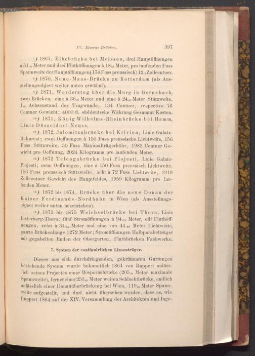 Dieses aus sich durchdringenden, gekrümmten Gurtungen bestehende System wurde bekanntlich 1864 von Ruppert anlässlich seines Projectes einer Bosporusbrücke( 205., Meter maximale Spannweite), ferner einer 253.0 Meter weiten Schluchtbrücke, endlich anlässlich einer Donauüberbrückung bei Wien, 119.0 Meter Spannweite aufgestellt, und darf nicht übersehen werden, dass es, wie Ruppert 1864 auf der XIV. Versammlung der Architekten und Inge