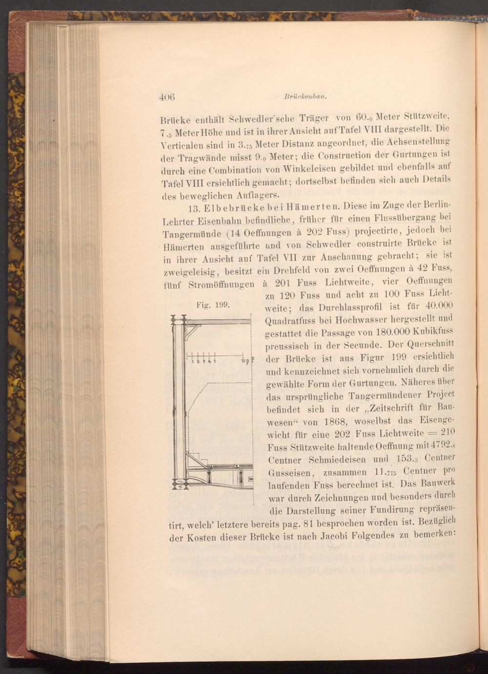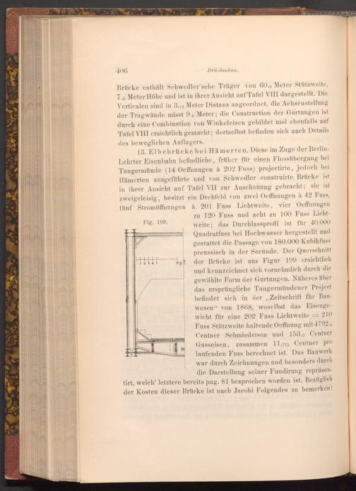 13. Elbebrücke bei Hämerten. Diese im Zuge der BerlinLehrter Eisenbahn befindliche, früher für einen Flussübergang bei Tangermünde( 14 Oeffnungen à 202 Fuss) projectirte, jedoch bei Hämerten ausgeführte und von Schwedler construirte Brücke ist in ihrer Ansicht auf Tafel VII zur Anschauung gebracht; sie ist zweigeleisig, besitzt ein Drehfeld von zwei Oeffnungen à 42 Fuss, fünf Stromöffnungen à 201 Fuss Lichtweite, vier Oeffnungen zu 120 Fuss und acht zu 100 Fuss Lichtweite; das Durchlassprofil ist für 40.000 Quadratfuss bei Hochwasser hergestellt und gestattet die Passage von 180.000 Kubikfuss preussisch in der Secunde. Der Querschnitt der Brücke ist aus Figur 199 ersichtlich und kennzeichnet sich vornehmlich durch die gewählte Form der Gurtungen. Näheres über das ursprüngliche Tangermündener Project befindet sich in der Zeitschrift für Bauwesen" von 1868, woselbst das Eisengewicht für eine 202 Fuss Lichtweite Fuss Stützweite haltende Oeffnung mit 4792.8 Centner Schmiedeisen und 153., Centner Gusseisen, zusammen 11.775 Centner pro laufenden Fuss berechnet ist. Das Bauwerk war durch Zeichnungen und besonders durch die Darstellung seiner Fundirung repräsentirt, welch' letztere bereits pag. 81 besprochen worden ist. Bezüglich der Kosten dieser Brücke ist nach Jacobi Folgendes zu bemerken: