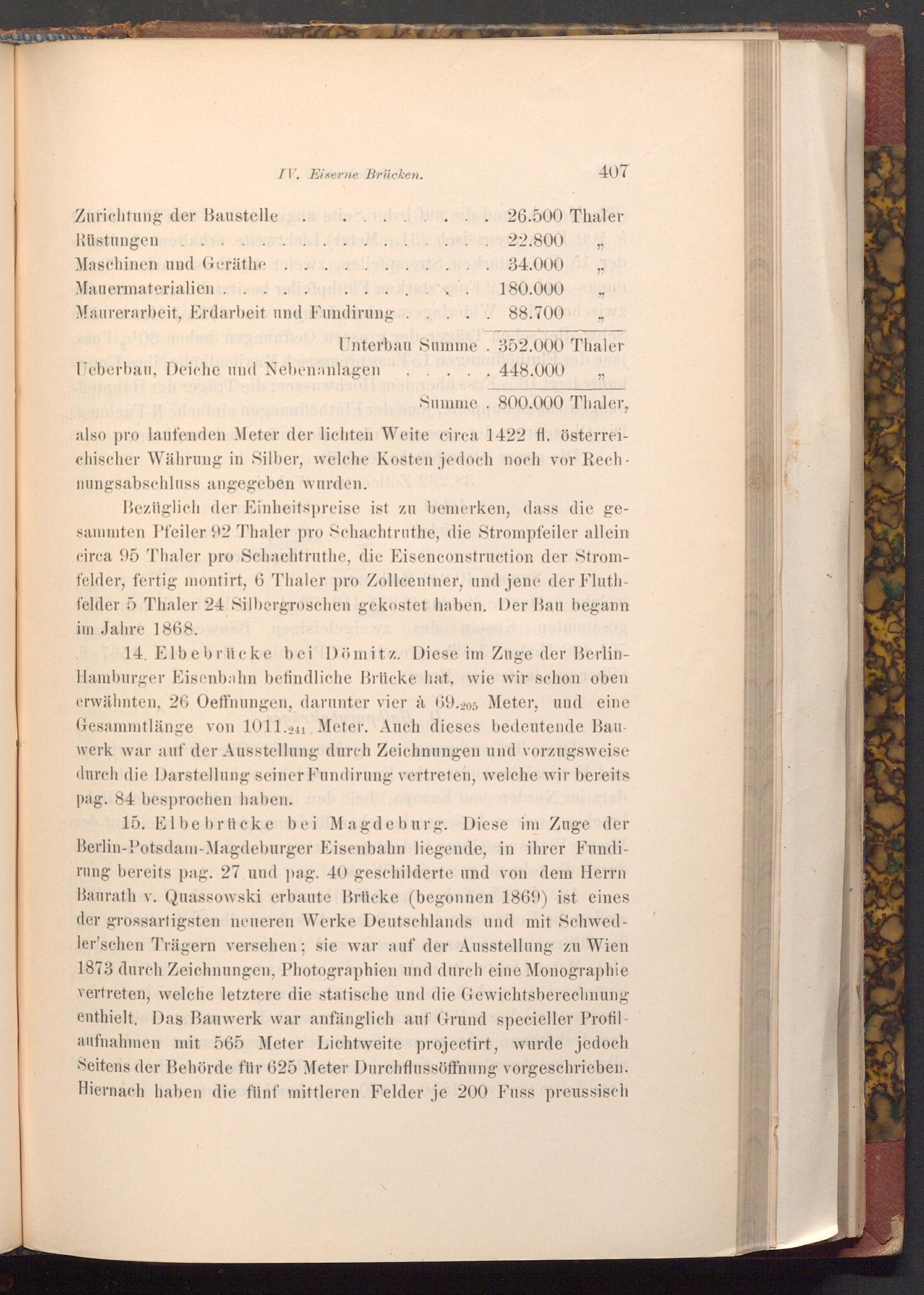Bezüglich der Einheitspreise ist zu bemerken, dass die gesammten Pfeiler 92 Thaler pro Schachtruthe, die Strompfeiler allein circa 95 Thaler pro Schachtruthe, die Eisenconstruction der Stromfelder, fertig montirt, 6 Thaler pro Zollcentner, und jene der Fluthfelder 5 Thaler 24 Silbergroschen gekostet haben. Der Bau begann im Jahre 1868. ad feiologio web