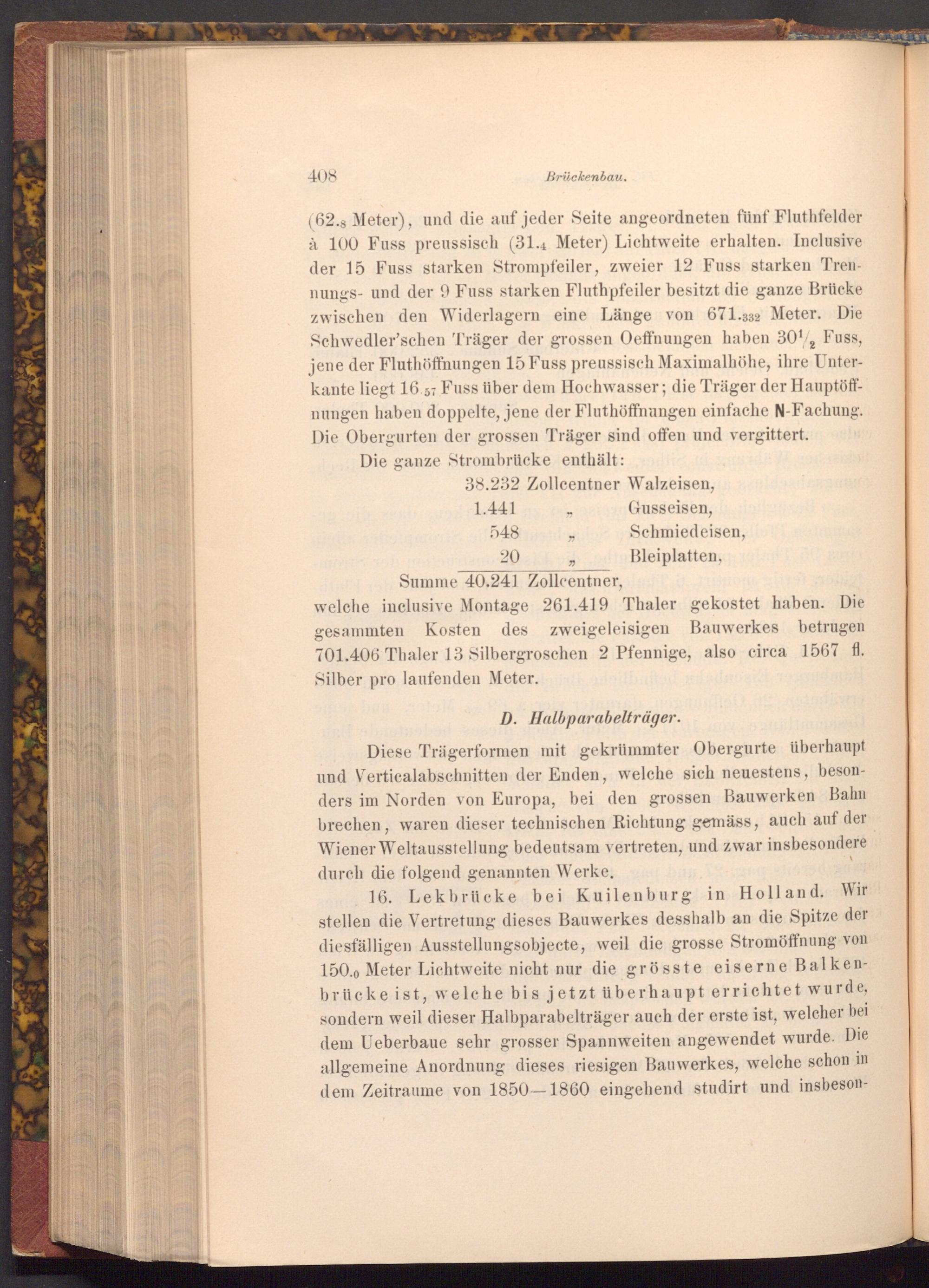 16. Lekbrücke bei Kuilenburg in Holland. Wir stellen die Vertretung dieses Bauwerkes desshalb an die Spitze der diesfälligen Ausstellungsobjecte, weil die grosse Stromöffnung von 150., Meter Lichtweite nicht nur die grösste eiserne Balkenbrücke ist, welche bis jetzt überhaupt errichtet wurde, sondern weil dieser Halbparabelträger auch der erste ist, welcher bei dem Ueberbaue sehr grosser Spannweiten angewendet wurde. Die allgemeine Anordnung dieses riesigen Bauwerkes, welche schon in dem Zeitraume von 1850-1860 eingehend studirt und insbeson