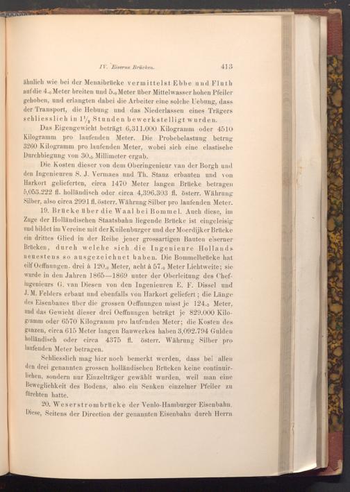 Die Kosten dieser von dem Oberingenieur van der Borgh und den Ingenieuren S. J. Vermaes und Th. Stanz erbauten und von Harkort gelieferten, circa 1470 Meter langen Brücke betragen 5,053.222 fl. holländisch oder circa 4,396.303 fl. österr. Währung Silber, also circa 2991 fl. österr. Währung Silber pro laufenden Meter. 19. Brücke über die Waal bei Bommel. Auch diese, im Zuge der Holländischen Staatsbahn liegende Brücke ist eingeleisig und bildet im Vereine mit der Kuilenburger und der Moerdijker Brücke ein drittes Glied in der Reihe jener grossartigen Bauten eiserner Brücken, durch welche sich die Ingenieure Hollands neuestens so ausgezeichnet haben. Die Bommelbrücke hat eilf Oeffnungen, drei à 120.0 Meter, acht à 57.0 Meter Lichtweite; sie wurde in den Jahren 1865-1869 unter der Oberleitung des Chefingenieurs G. van Diesen von den Ingenieuren E. F. Dissel und J. M. Felders erbaut und ebenfalls von Harkort geliefert; die Länge des Eisenbaues über die grossen Oeffnungen misst je 124.3 Meter, und das Gewicht dieser drei Oeffnungen beträgt je 829.000 Kilogramm oder 6570 Kilogramm pro laufenden Meter; die Kosten des ganzen, circa 615 Meter langen Bauwerkes haben 3,092.794 Gulden holländisch oder circa 4375 fl. österr. Währung Silber pro laufenden Meter betragen.