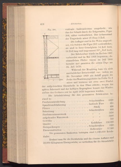 Die Auflager sind in der Weise angeordnet, wie Solches die Figur 207 verdeutlichet; sie sind in ihrer Grundplatte 54 Zoll breit, 56 Zoll lang und insgesammt 391, Zoll hoch. Der Brückenbau wurde im Herbste 1867 vorbereitet und im Mai 1868 begonnen; die sämmtlichen Pfeiler waren im Juli 1868 beendet und passirten die ersten Züge am go24. Juli 1870.