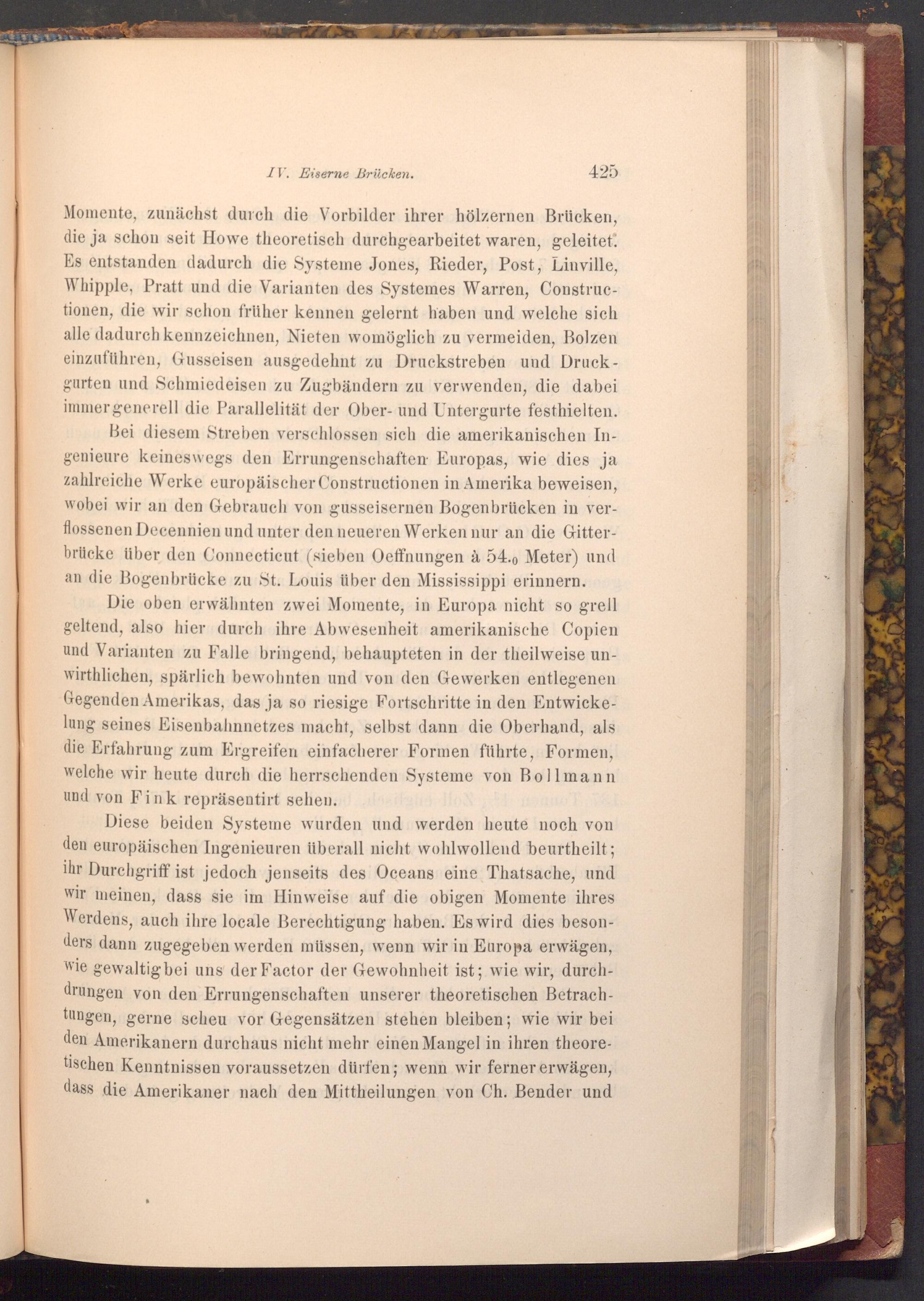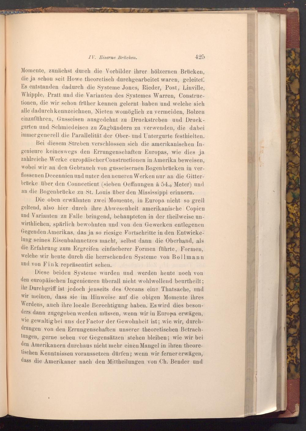 Momente, zunächst durch die Vorbilder ihrer hölzernen Brücken, die ja schon seit Howe theoretisch durchgearbeitet waren, geleitet. Es entstanden dadurch die Systeme Jones, Rieder, Post, Linville, Whipple, Pratt und die Varianten des Systemes Warren, Constructionen, die wir schon früher kennen gelernt haben und welche sich alle dadurch kennzeichnen, Nieten womöglich zu vermeiden, Bolzen einzuführen, Gusseisen ausgedehnt zu Druckstreben und Druckgurten und Schmiedeisen zu Zugbändern zu verwenden, die dabei immer generell die Parallelität der Ober- und Untergurte festhielten.