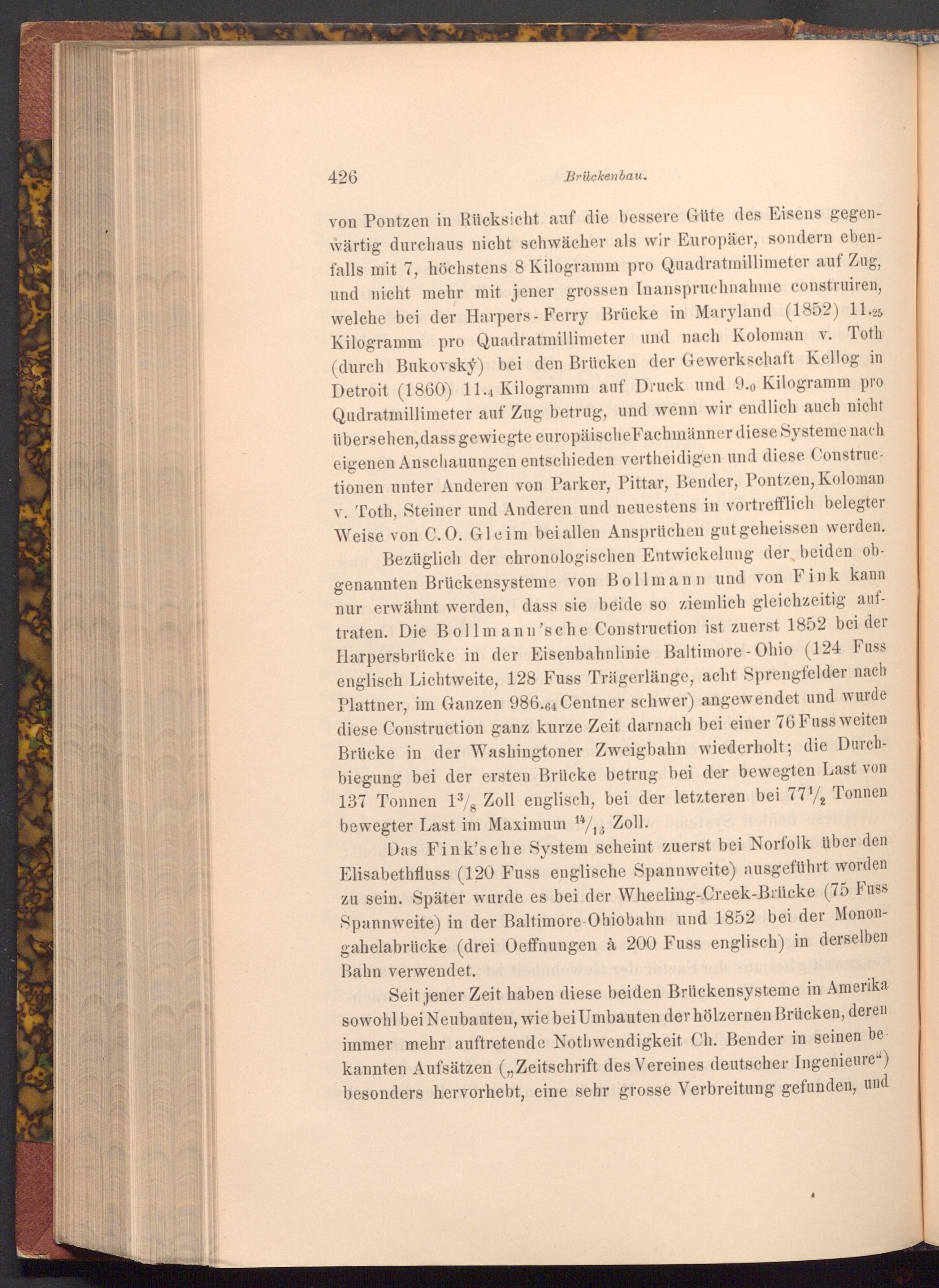 von Pontzen in Rücksicht auf die bessere Güte des Eisens gegenwärtig durchaus nicht schwächer als wir Europäer, sondern ebenfalls mit 7, höchstens 8 Kilogramm pro Quadratmillimeter auf Zug, und nicht mehr mit jener grossen Inanspruchnahme construiren, welche bei der Harpers Ferry Brücke in Maryland( 1852) 11.25 Kilogramm pro Quadratmillimeter und nach Koloman v. Toth ( durch Bukovský) bei den Brücken der Gewerkschaft Kellog in Detroit( 1860) 11.4 Kilogramm auf Druck und 9., Kilogramm pro Qudratmillimeter auf Zug betrug, und wenn wir endlich auch nicht übersehen, dass gewiegte europäische Fachmänner diese Systeme nach eigenen Anschauungen entschieden vertheidigen und diese Constructionen unter Anderen von Parker, Pittar, Bender, Pontzen, Koloman v. Toth, Steiner und Anderen und neuestens in vortrefflich belegter Weise von C.O. Gleim bei allen Ansprüchen gut geheissen werden. Bezüglich der chronologischen Entwickelung der beiden obgenannten Brückensysteme von Bollmann und von Fink kann nur erwähnt werden, dass sie beide so ziemlich gleichzeitig auftraten. Die Bollmann'sche Construction ist zuerst 1852 bei der Harpersbrücke in der Eisenbahnlinie Baltimore- Ohio( 124 Fuss englisch Lichtweite, 128 Fuss Trägerlänge, acht Sprengfelder nach Plattner, im Ganzen 986.64 Centner schwer) angewendet und wurde diese Construction ganz kurze Zeit darnach bei einer 76 Fuss weiten Brücke in der Washingtoner Zweigbahn wiederholt; die Durchbiegung bei der ersten Brücke betrug bei der bewegten Last von Tonnen 137 Tonnen 13 Zoll englisch, bei der letzteren bei 77½ bewegter Last im Maximum 14 Zoll. stare nellied