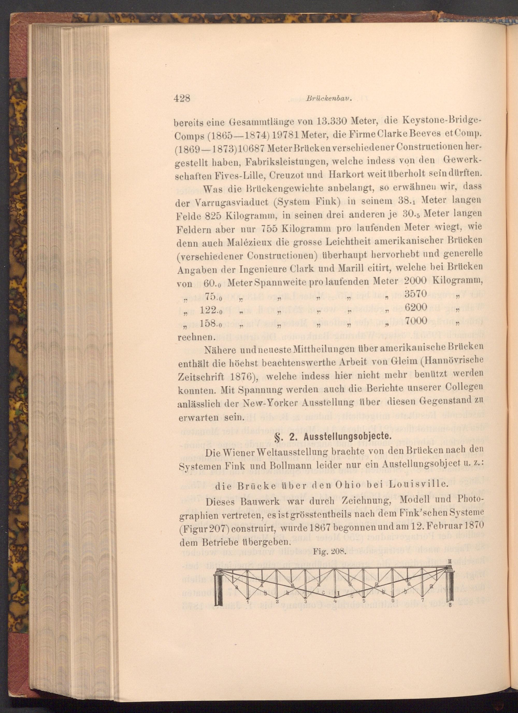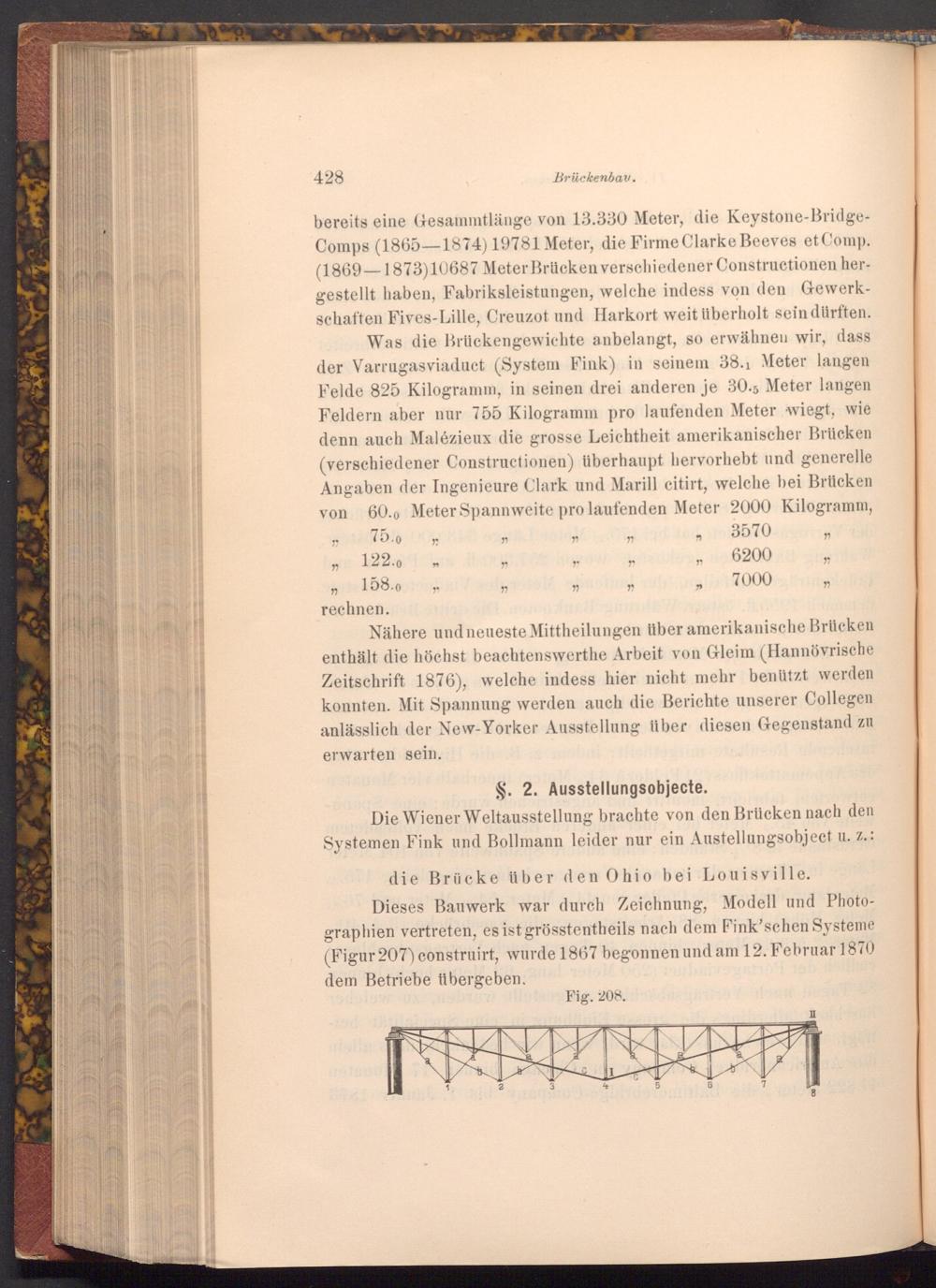 Dieses Bauwerk war durch Zeichnung, Modell und Photographien vertreten, es ist grösstentheils nach dem Fink'schen Systeme ( Figur 207) construirt, wurde 1867 begonnen und am 12. Februar 1870 dem Betriebe übergeben.