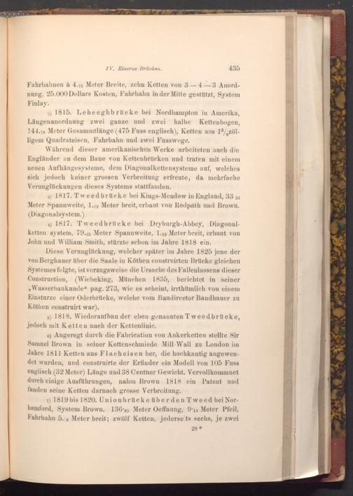 6) Angeregt durch die Fabrication von Ankerketten stellte Sir Samuel Brown in seiner Kettenschmiede Mill Wall zu London im Jahre 1811 Ketten aus Flacheisen her, die hochkantig angewendet wurden, und construirte der Erfinder ein Modell von 105 Fuss englisch( 32 Meter) Länge und 38 Centner Gewicht. Vervollkommnet durch einige Ausführungen, nahm Brown 1818 ein Patent und fanden seine Ketten darnach grosse Verbreitung.