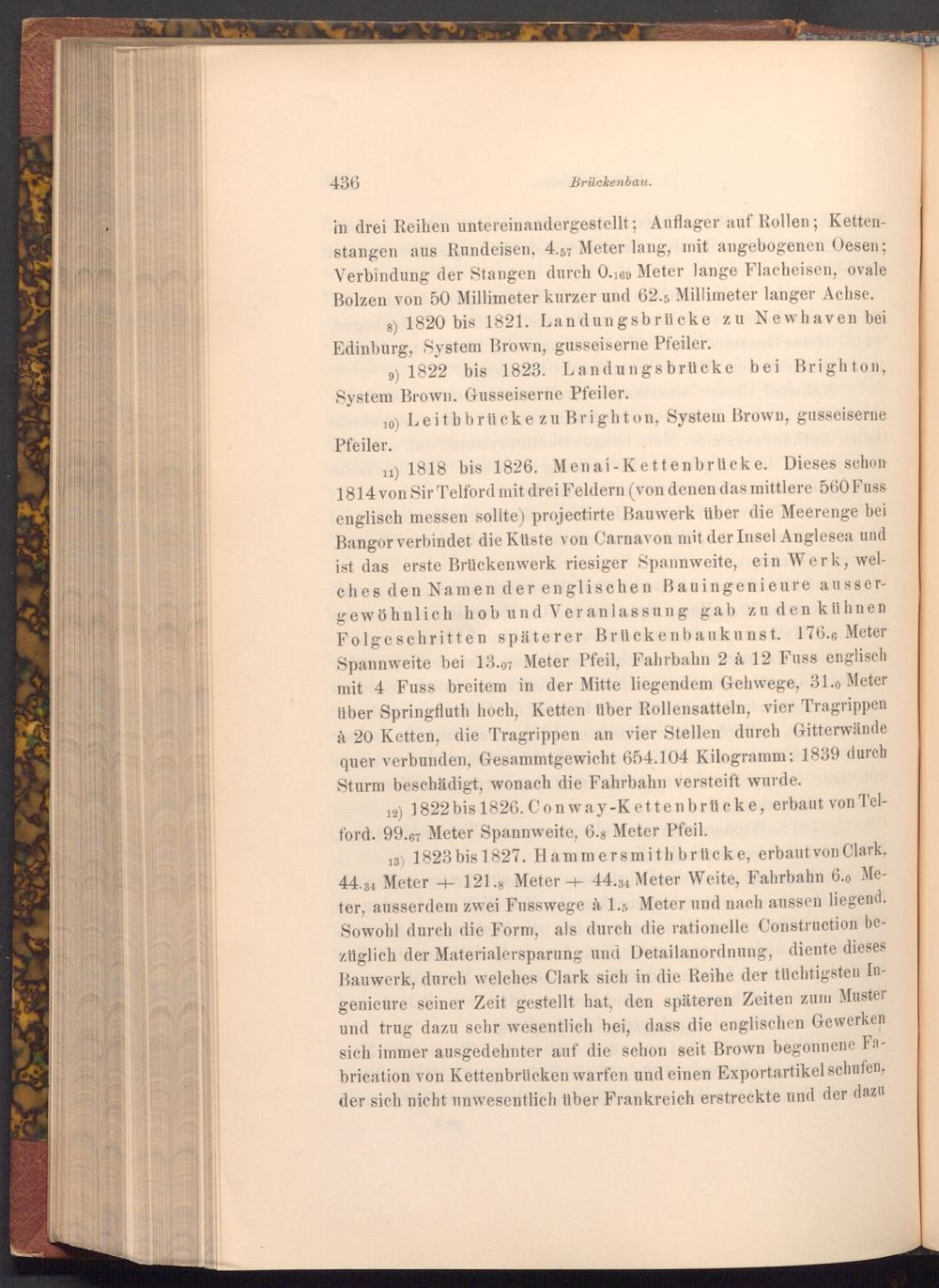 13) 1823 bis 1827. Hammersmith brücke, erbaut von Clark, 44.34 Meter+ 121.8 Meter+ 44.34 Meter Weite, Fahrbahn 6.0 Meter, ausserdem zwei Fusswege à 1.5 Meter und nach aussen liegend. Sowohl durch die Form, als durch die rationelle Construction bezüglich der Materialersparung und Detailanordnung, diente dieses Bauwerk, durch welches Clark sich in die Reihe der tüchtigsten Ingenieure seiner Zeit gestellt hat, den späteren Zeiten zum Muster und trug dazu sehr wesentlich bei, dass die englischen Gewerken sich immer ausgedehnter auf die schon seit Brown begonnene Fabrication von Kettenbrücken warfen und einen Exportartikel schufen, der sich nicht unwesentlich über Frankreich erstreckte und der dazu