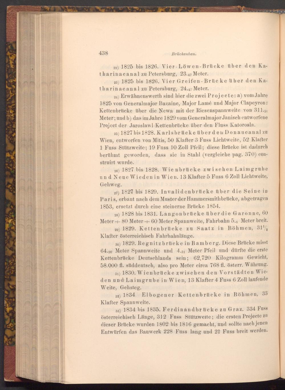 25) 1827 bis 1828. Karlsbrücke über den Donaucanal zu Wien, entworfen von Mitis, 50 Klafter 3 Fuss Lichtweite, 52 Klafter 1 Fuss Stützweite; 19 Fuss 10 Zoll Pfeil; diese Brücke ist dadurch berühmt geworden, dass sie in Stahl( vergleiche pag. 370) construirt wurde. Mi