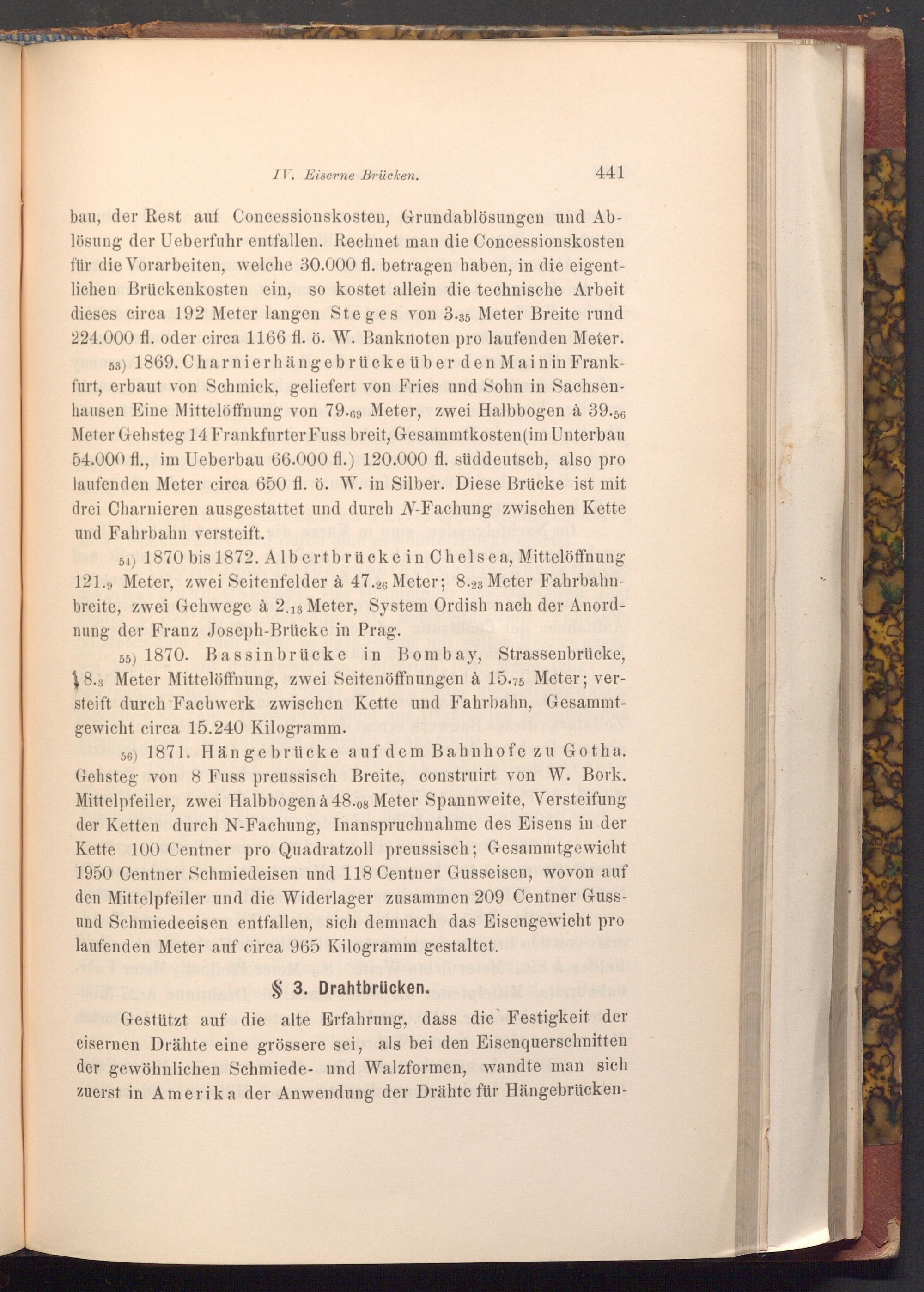 53) 1869. Charnierhängebrücke über den Main in Frankfurt, erbaut von Schmick, geliefert von Fries und Sohn in Sachsenhausen Eine Mittelöffnung von 79.69 Meter, zwei Halbbogen à 39.56 Meter Gehsteg 14 Frankfurter Fuss breit, Gesammtkosten( im Unterbau 54.000 fl., im Ueberbau 66.000 fl.) 120.000 fl. süddeutsch, also pro laufenden Meter circa 650 fl. ö. W. in Silber. Diese Brücke ist mit drei Charnieren ausgestattet und durch N- Fachung zwischen Kette und Fahrbahn versteift.