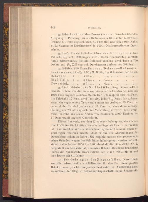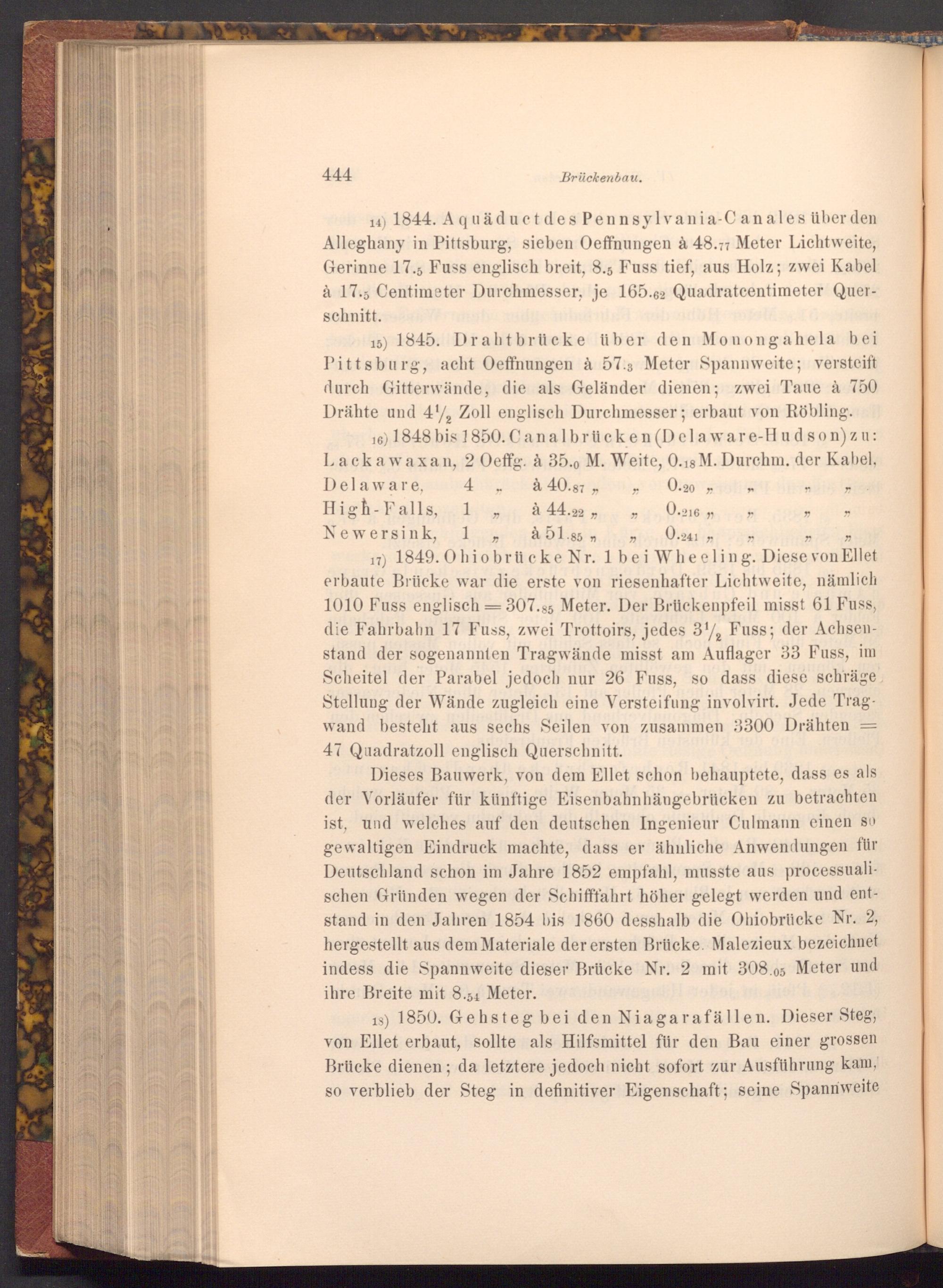 15) 1845. Drahtbrücke über den Monongahela bei Pittsburg, acht Oeffnungen à 57.3 Meter Spannweite; versteift durch Gitterwände, die als Geländer dienen; zwei Taue à 750 Drähte und 41 Zoll englisch Durchmesser; erbaut von Röbling.