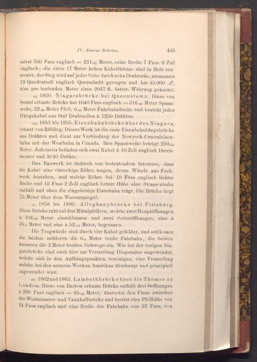 1851 bis 1855. Eisenbahnbrücke über den Niagara, erbaut von Röbling. Dieses Werk ist die erste Eisenbahnhängebrücke aus Drähten und dient zur Verbindung der Newyork- Centraleisenbahn mit der Westbahn in Canada. Ihre Spannweite beträgt 250.34 Meter. Jederseits befinden sich zwei Kabel à 10 Zoll englisch Durchmesser und 3640 Drähte.