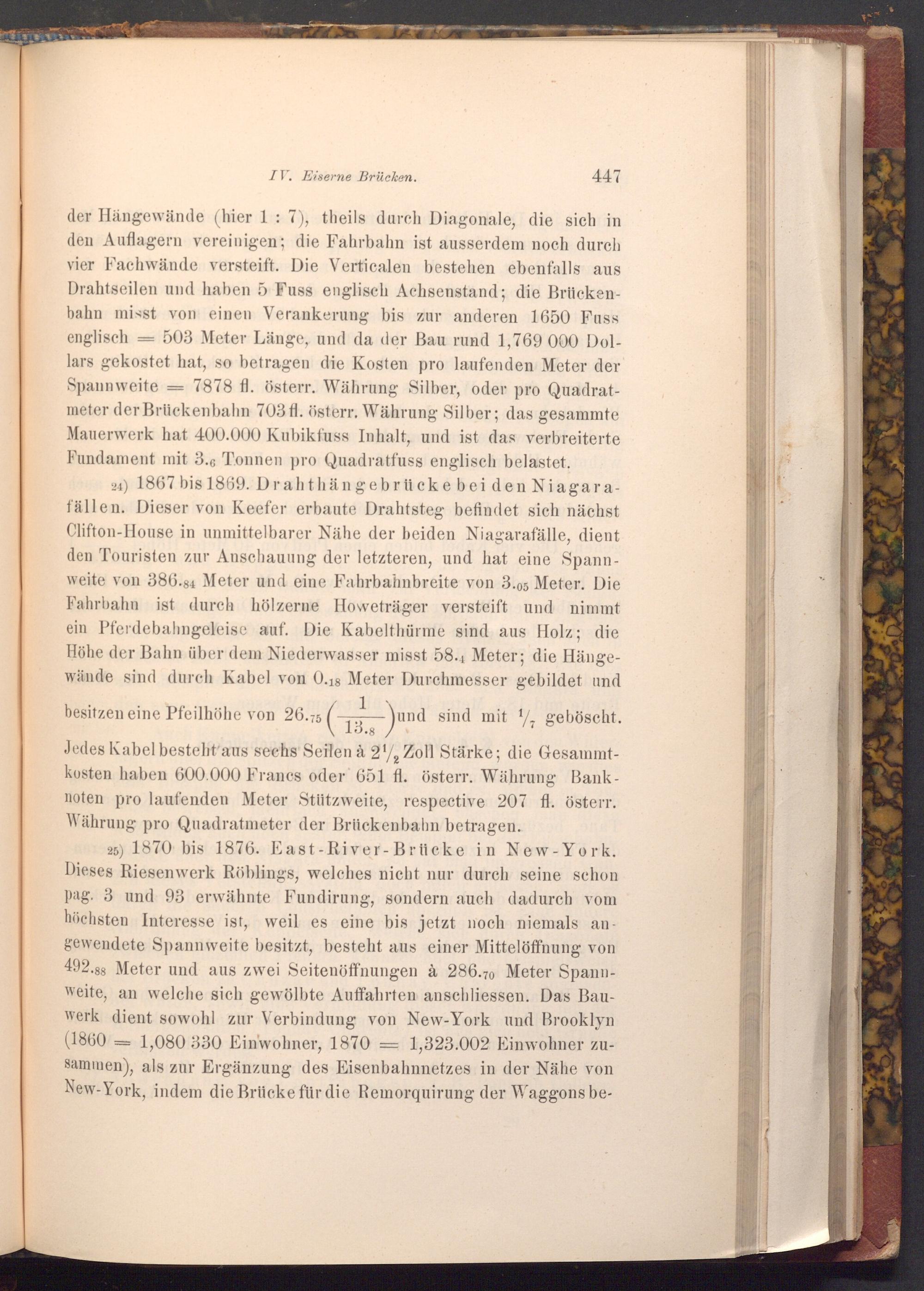 25) 1870 bis 1876. East- River- Brücke in New- York. Dieses Riesenwerk Röblings, welches nicht nur durch seine schon pag. 3 und 93 erwähnte Fundirung, sondern auch dadurch vom höchsten Interesse ist, weil es eine bis jetzt noch niemals angewendete Spannweite besitzt, besteht aus einer Mittelöffnung von 492.88 Meter und aus zwei Seitenöffnungen à 286.70 Meter Spannweite, an welche sich gewölbte Auffahrten anschliessen. Das Bauwerk dient sowohl zur Verbindung von New- York und Brooklyn ( 1860 1,080 330 Einwohner, 1870€ 1,323.002 Einwohner zusammen), als zur Ergänzung des Eisenbahnnetzes in der Nähe von New- York, indem die Brücke für die Remorquirung der Waggons be