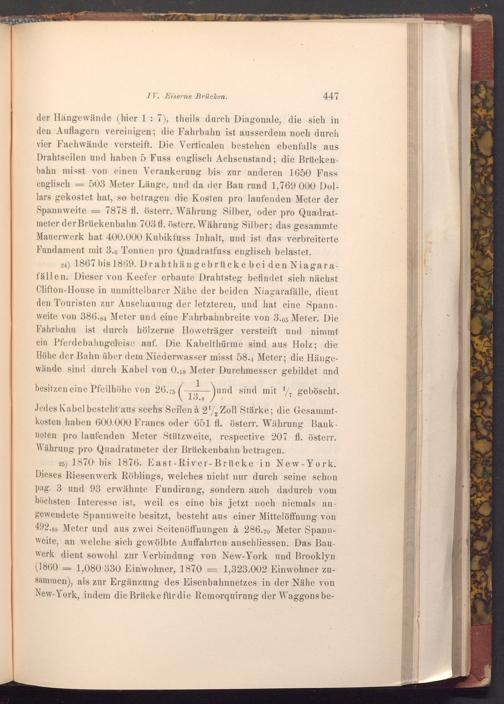 der Hängewände( hier 1: 7), theils durch Diagonale, die sich in den Auflagern vereinigen; die Fahrbahn ist ausserdem noch durch vier Fachwände versteift. Die Verticalen bestehen ebenfalls aus Drahtseilen und haben 5 Fuss englisch Achsenstand; die Brückenbahn misst von einen Verankerung bis zur anderen 1650 Fuss englisch 503 Meter Länge, und da der Bau rund 1,769 000 Dollars gekostet hat, so betragen die Kosten pro laufenden Meter der Spannweite 7878 fl. österr. Währung Silber, oder pro Quadratmeter der Brückenbahn 703 fl. österr. Währung Silber; das gesammte Mauerwerk hat 400.000 Kubikfuss Inhalt, und ist das verbreiterte Fundament mit 3.6 Tonnen pro Quadratfuss englisch belastet.