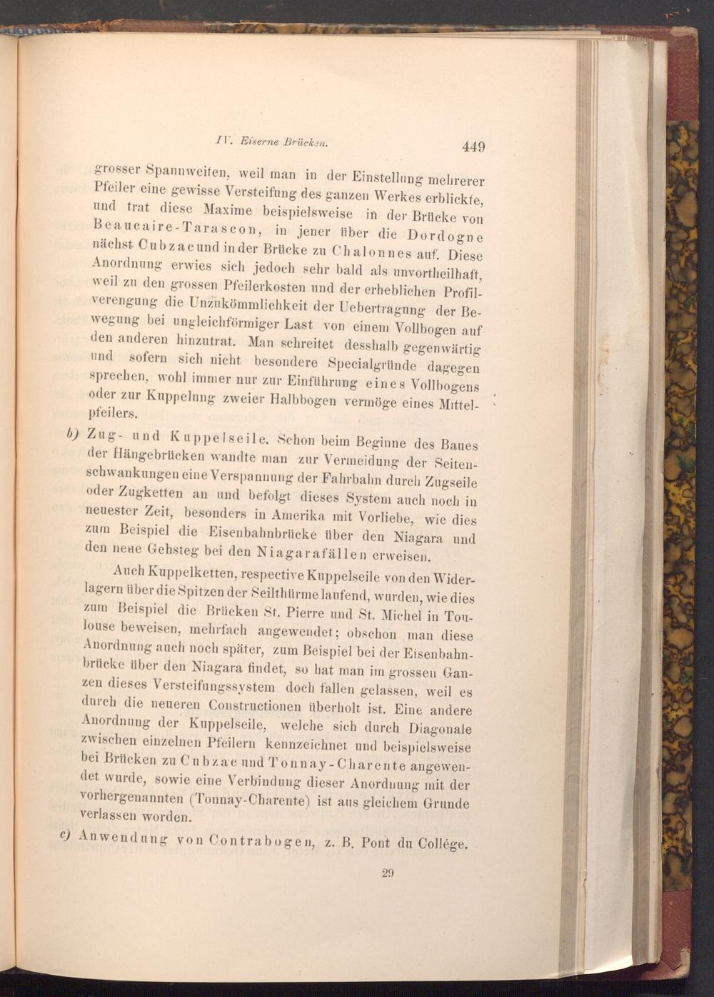 Auch Kuppelketten, respective Kuppelseile von den Widerlagern über die Spitzen der Seilthürme laufend, wurden, wie dies zum Beispiel die Brücken St. Pierre und St. Michel in Toulouse beweisen, mehrfach angewendet; obschon man diese Anordnung auch noch später, zum Beispiel bei der Eisenbahnbrücke über den Niagara findet, so hat man im grossen Ganzen dieses Versteifungssystem doch fallen gelassen, weil es durch die neueren Constructionen überholt ist. Eine andere Anordnung der Kuppelseile, welche sich durch Diagonale zwischen einzelnen Pfeilern kennzeichnet und beispielsweise bei Brücken zu Cubzac und Tonnay- Charente angewendet wurde, sowie eine Verbindung dieser Anordnung mit der vorhergenannten( Tonnay- Charente) ist aus gleichem Grunde verlassen worden.
