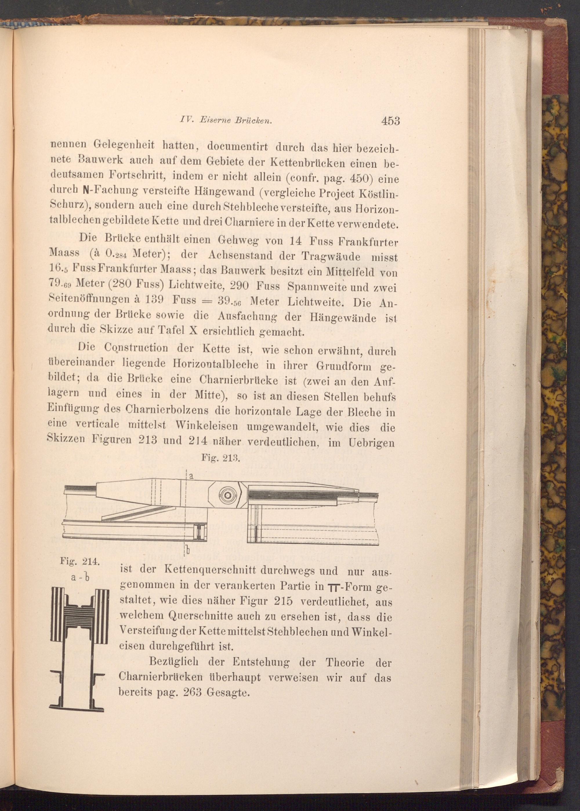 nennen Gelegenheit hatten, documentirt durch das hier bezeichnete Bauwerk auch auf dem Gebiete der Kettenbrücken einen bedeutsamen Fortschritt, indem er nicht allein( confr. pag. 450) eine durch N- Fachung versteifte Hängewand( vergleiche Project KöstlinSchurz), sondern auch eine durch Stehbleche versteifte, aus Horizontalblechen gebildete Kette und drei Charniere in der Kette verwendete.