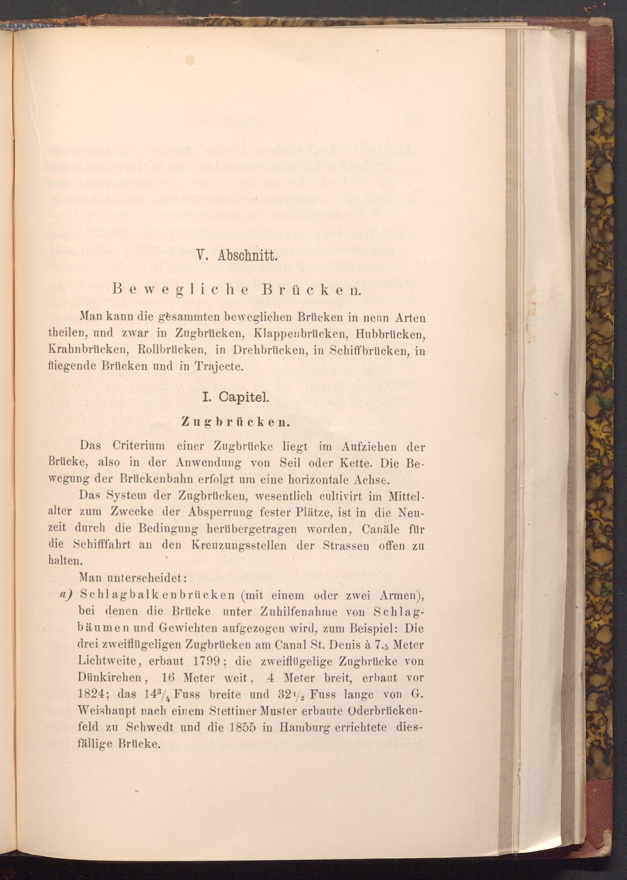 a) Schlagbalkenbrücken( mit einem oder zwei Armen), bei denen die Brücke unter Zuhilfenahme von Schlagbäumen und Gewichten aufgezogen wird, zum Beispiel: Die drei zweiflügeligen Zugbrücken am Canal St. Denis à 7.5 Meter Lichtweite, erbaut 1799; die zweiflügelige Zugbrücke von Dünkirchen, 16 Meter weit, 4 Meter breit, erbaut vor 1824; das 1434 Fuss breite und 3212 Fuss lange von G. Weishaupt nach einem Stettiner Muster erbaute Oderbrückenfeld zu Schwedt und die 1855 in Hamburg errichtete diesfällige Brücke.