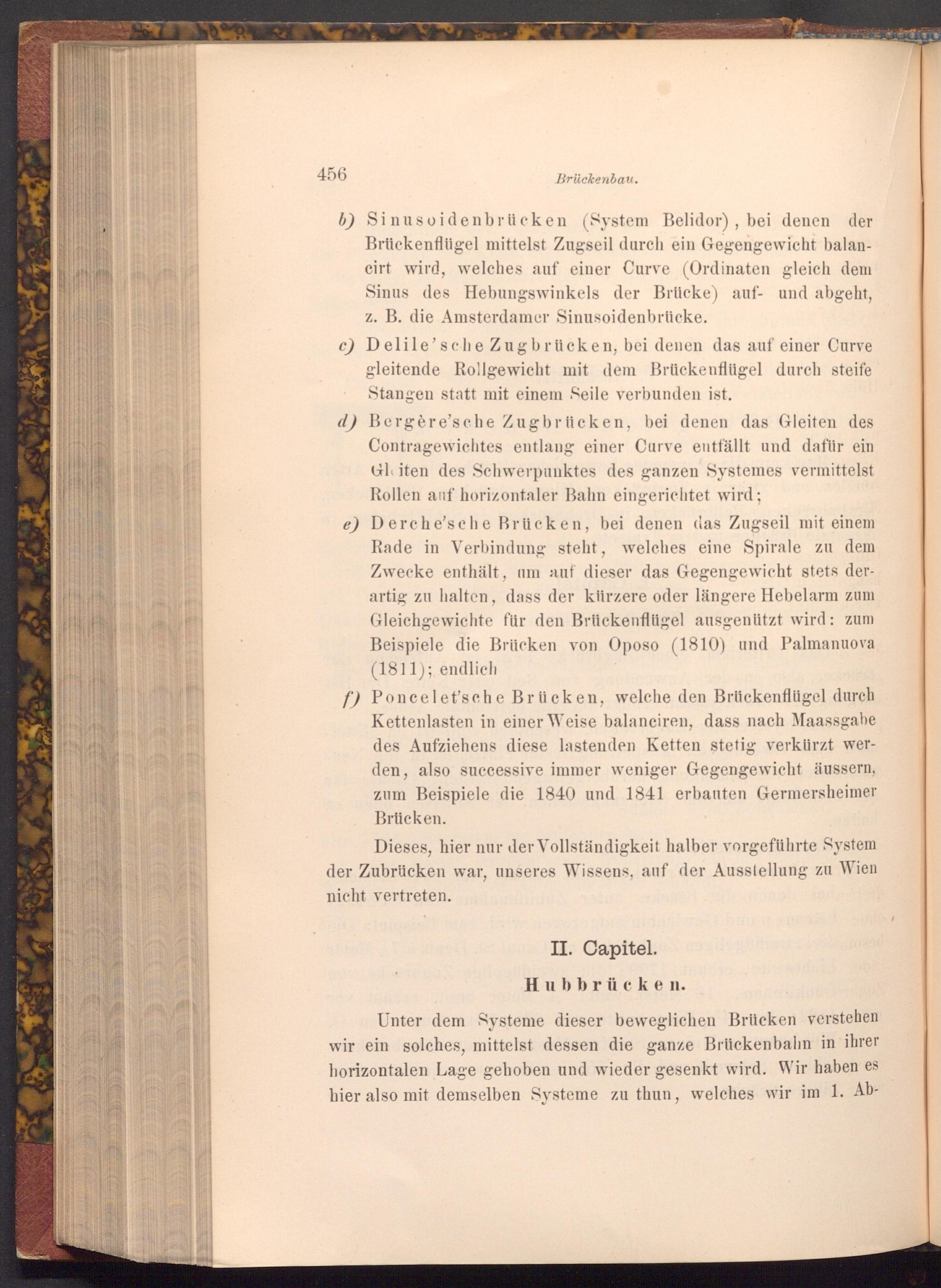 f) Poncelet'sche Brücken, welche den Brückenflügel durch Kettenlasten in einer Weise balanciren, dass nach Maassgabe des Aufziehens diese lastenden Ketten stetig verkürzt werden, also successive immer weniger Gegengewicht äussern, zum Beispiele die 1840 und 1841 erbauten Germersheimer Brücken.