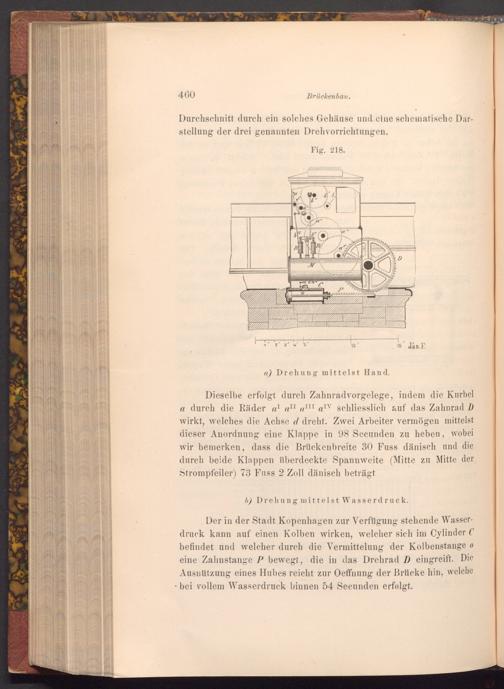 Dieselbe erfolgt durch Zahnradvorgelege, indem die Kurbel a durch die Räder a aII III IV schliesslich auf das Zahnrad D wirkt, welches die Achse d dreht. Zwei Arbeiter vermögen mittelst dieser Anordnung eine Klappe in 98 Secunden zu heben, wobei wir bemerken, dass die Brückenbreite 30 Fuss dänisch und die durch beide Klappen überdeckte Spannweite( Mitte zu Mitte der Strompfeiler) 73 Fuss 2 Zoll dänisch beträgt.