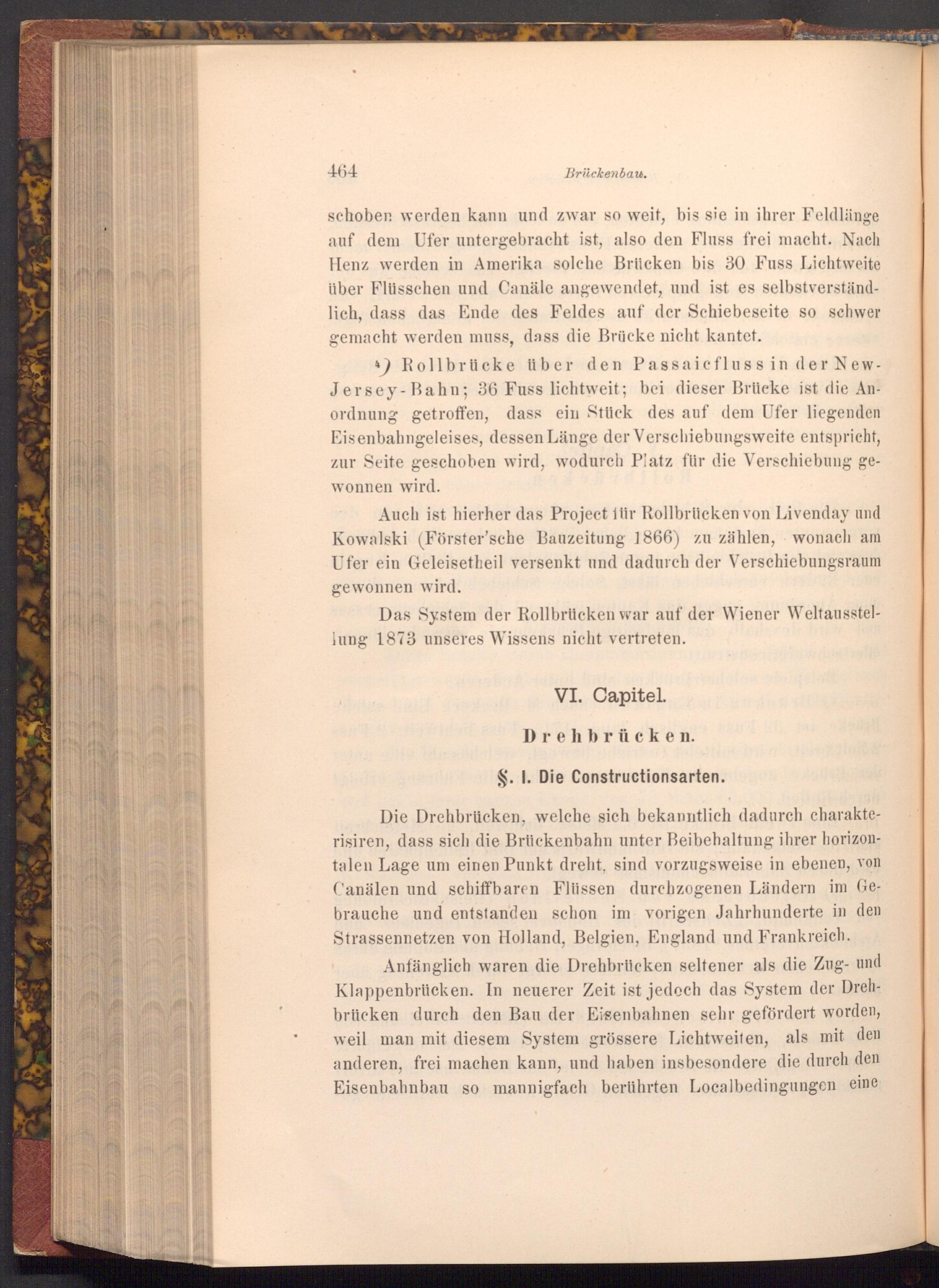 Anfänglich waren die Drehbrücken seltener als die Zug- und Klappenbrücken. In neuerer Zeit ist jedoch das System der Drehbrücken durch den Bau der Eisenbahnen sehr gefördert worden, weil man mit diesem System grössere Lichtweiten, als mit den anderen, frei machen kann, und haben insbesondere die durch den Eisenbahnbau so mannigfach berührten Localbedingungen eine