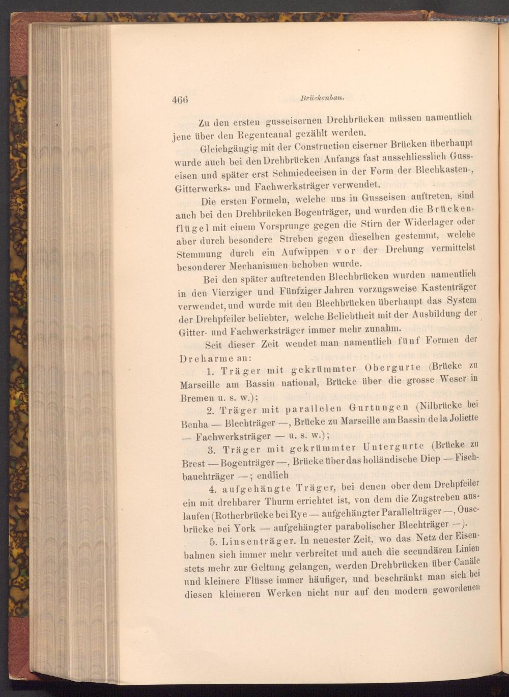 4. aufgehängte Träger, bei denen ober dem Drehpfeiler ein mit drehbarer Thurm errichtet ist, von dem die Zugstreben auslaufen( Rotherbrücke bei Rye aufgehängter Parallelträger-, Ousebrücke bei York- aufgehängter parabolischer Blechträger--).
