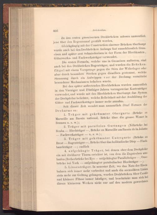 Gleichgängig mit der Construction eiserner Brücken überhaupt wurde auch bei den Drehbrücken Anfangs fast ausschliesslich Gusseisen und später erst Schmiedeeisen in der Form der Blechkasten-, Gitterwerks- und Fachwerksträger verwendet. B