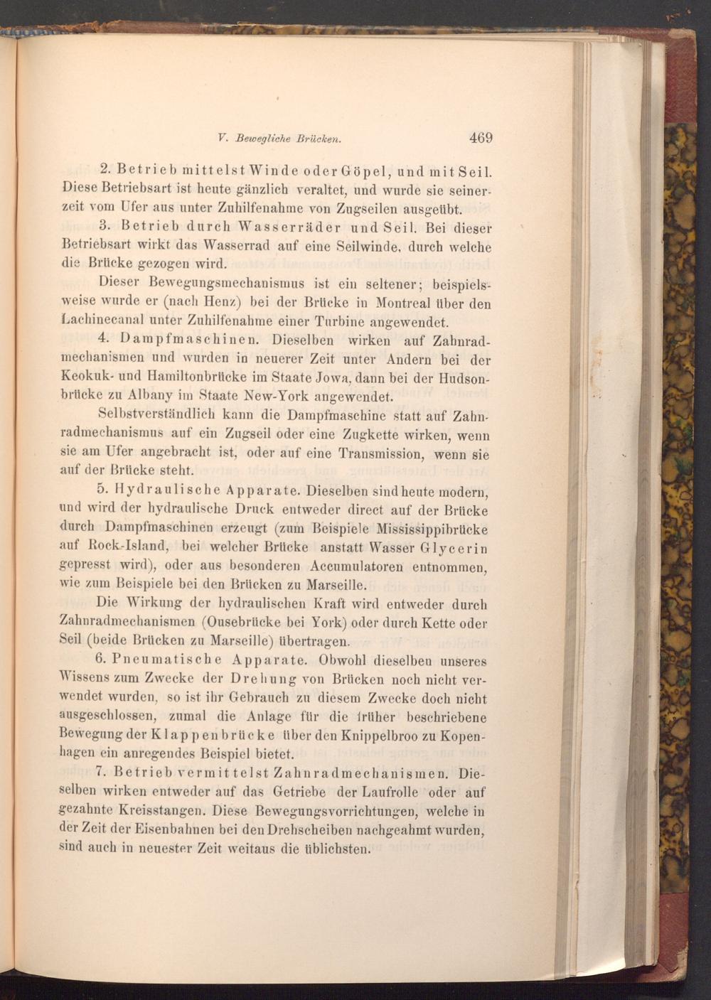 5. Hydraulische Apparate. Dieselben sind heute modern, und wird der hydraulische Druck entweder direct auf der Brücke durch Dampfmaschinen erzeugt( zum Beispiele Mississippibrücke auf Rock- Island, bei welcher Brücke anstatt Wasser Glycerin gepresst wird), oder aus besonderen Accumulatoren entnommen, wie zum Beispiele bei den Brücken zu Marseille.