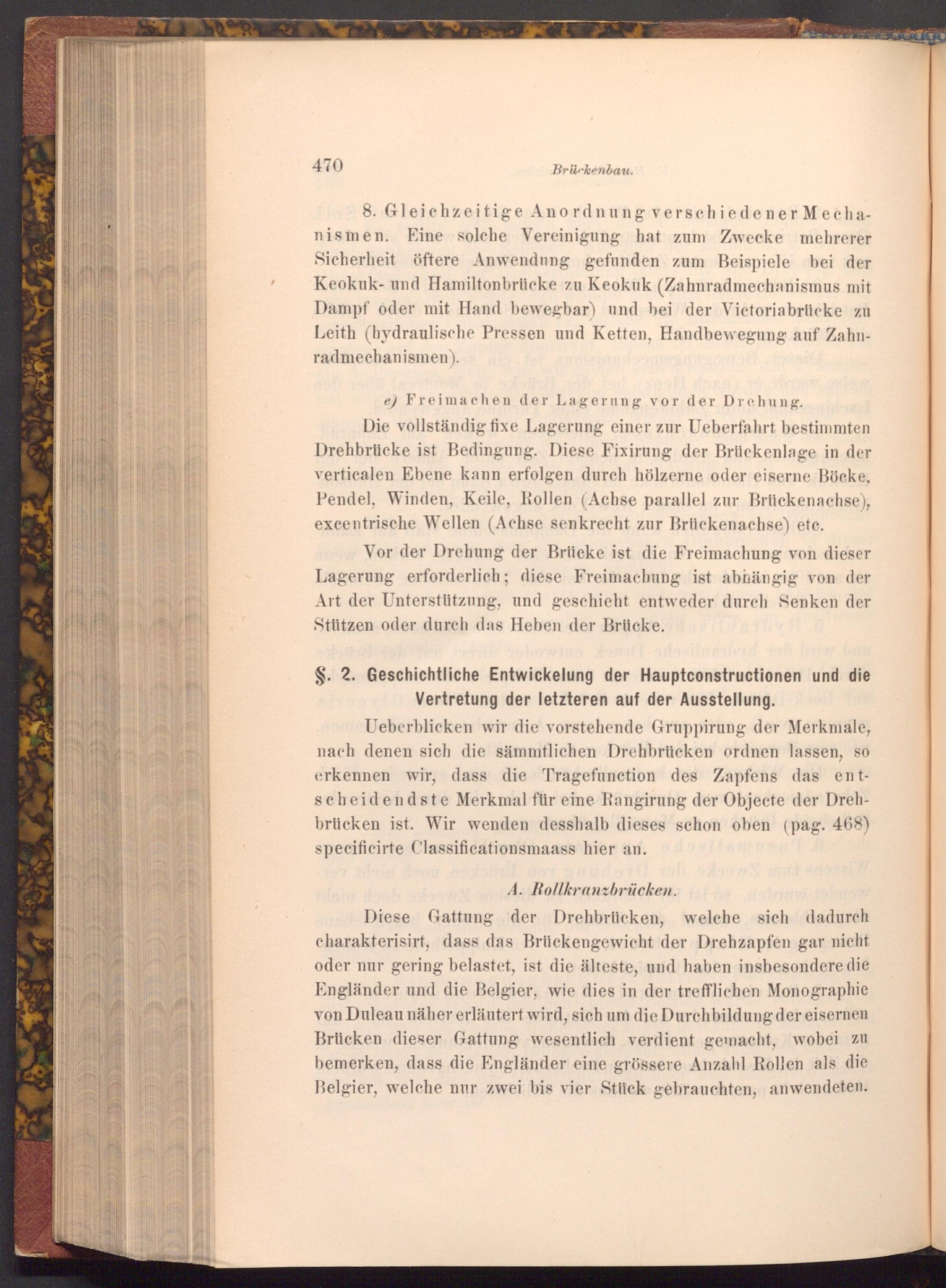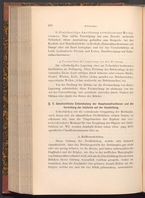 §. 2. Geschichtliche Entwickelung der Hauptconstructionen und die Vertretung der letzteren auf der Ausstellung.il dote Ueberblicken wir die vorstehende Gruppirung der Merkmale, nach denen sich die sämmtlichen Drehbrücken ordnen lassen, so erkennen wir, dass die Tragefunction des Zapfens das entscheidendste Merkmal für eine Rangirung der Objecte der Drehbrücken ist. Wir wenden desshalb dieses schon oben( pag. 468) specificirte Classificationsmaass hier an.
