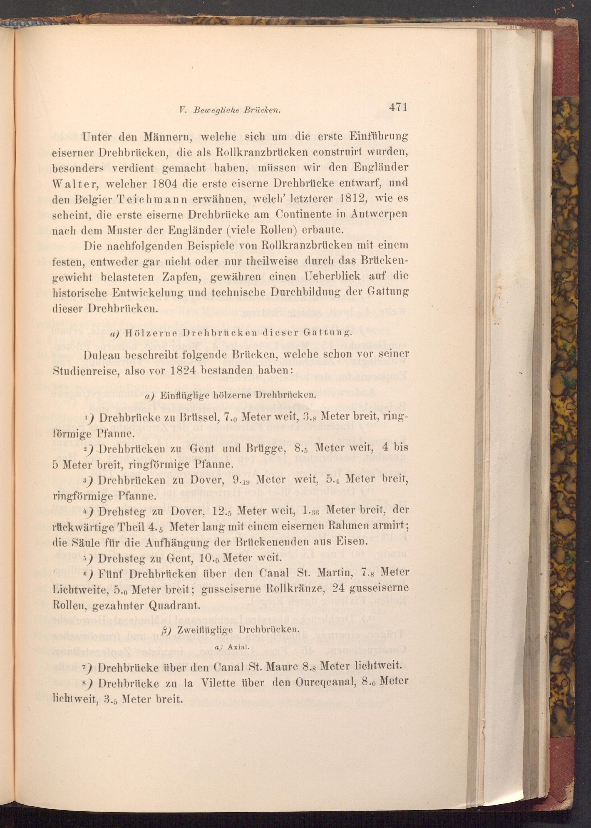 Unter den Männern, welche sich um die erste Einführung eiserner Drehbrücken, die als Rollkranzbrücken construirt wurden, besonders verdient gemacht haben, müssen wir den Engländer Walter, welcher 1804 die erste eiserne Drehbrücke entwarf, und den Belgier Teichmann erwähnen, welch' letzterer 1812, wie es scheint, die erste eiserne Drehbrücke am Continente in Antwerpen nach dem Muster der Engländer( viele Rollen) erbaute.