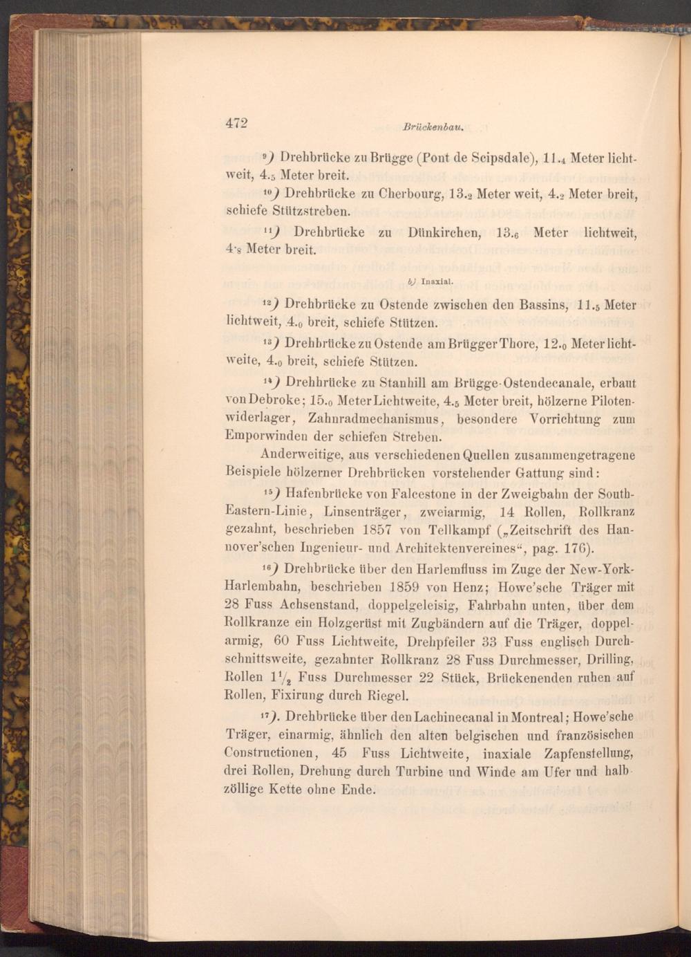 16) Drehbrücke über den Harlemfluss im Zuge der New- YorkHarlembahn, beschrieben 1859 von Henz; Howe'sche Träger mit 28 Fuss Achsenstand, doppelgeleisig, Fahrbahn unten, über dem Rollkranze ein Holzgerüst mit Zugbändern auf die Träger, doppelarmig, 60 Fuss Lichtweite, Drehpfeiler 33 Fuss englisch Durchschnittsweite, gezahnter Rollkranz 28 Fuss Durchmesser, Drilling, o Rollen 1 Fuss Durchmesser 22 Stück, Brückenenden ruhen auf Rollen, Fixirung durch Riegel.