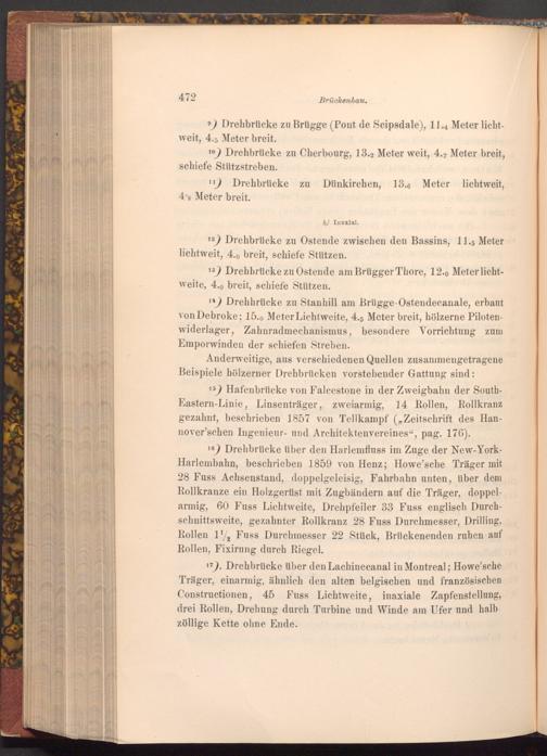 17). Drehbrücke über den Lachine canal in Montreal; Howe'sche Träger, einarmig, ähnlich den alten belgischen und französischen Constructionen, 45 Fuss Lichtweite, inaxiale Zapfenstellung, drei Rollen, Drehung durch Turbine und Winde am Ufer und halb zöllige Kette ohne Ende.
