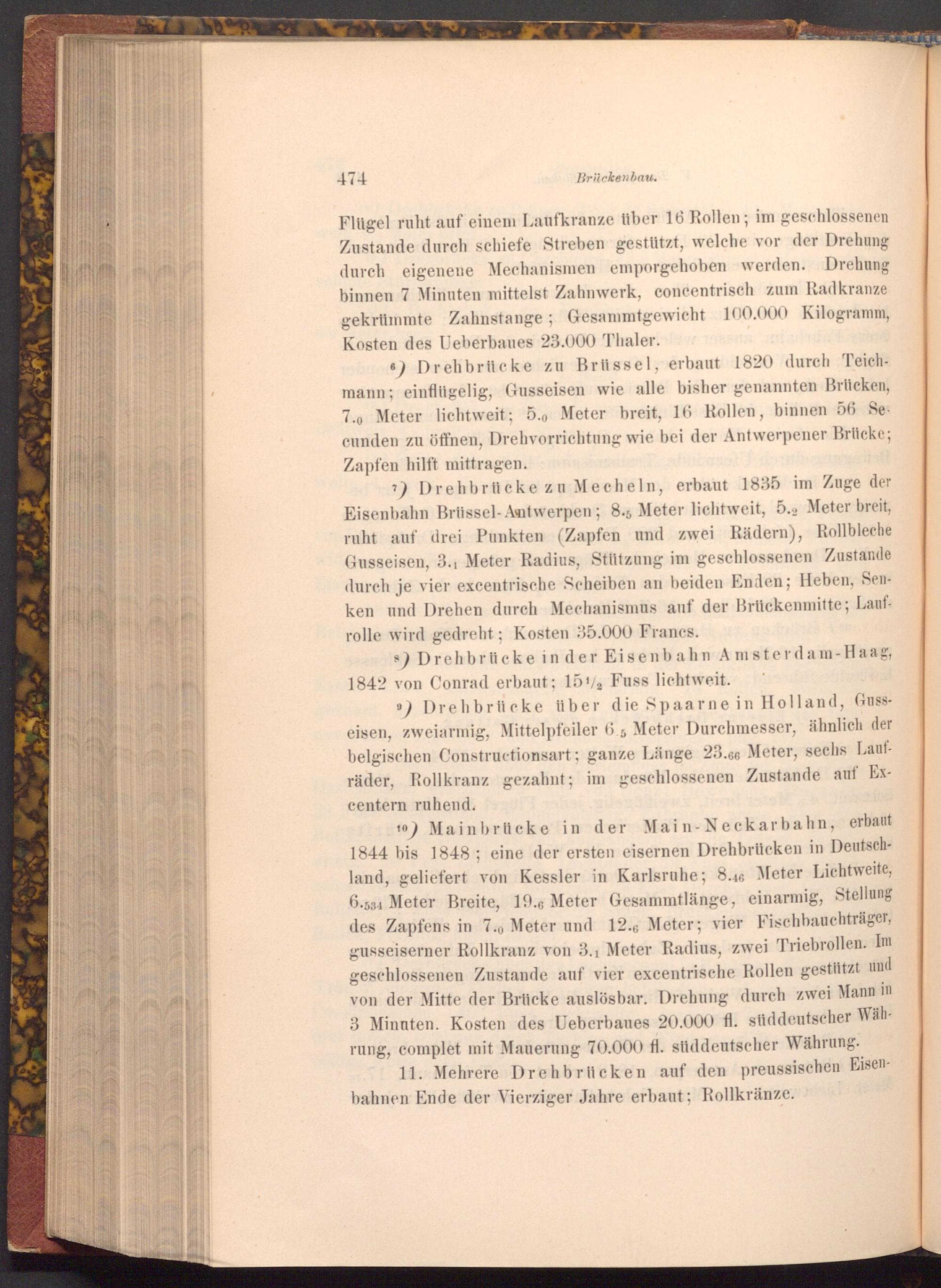 ) Drehbrücke über die Spaarne in Holland, Gusseisen, zweiarmig, Mittelpfeiler 6.5 Meter Durchmesser, ähnlich der belgischen Constructionsart; ganze Länge 23.66 Meter, sechs Laufräder, Rollkranz gezahnt; im geschlossenen Zustande auf Excentern ruhend.