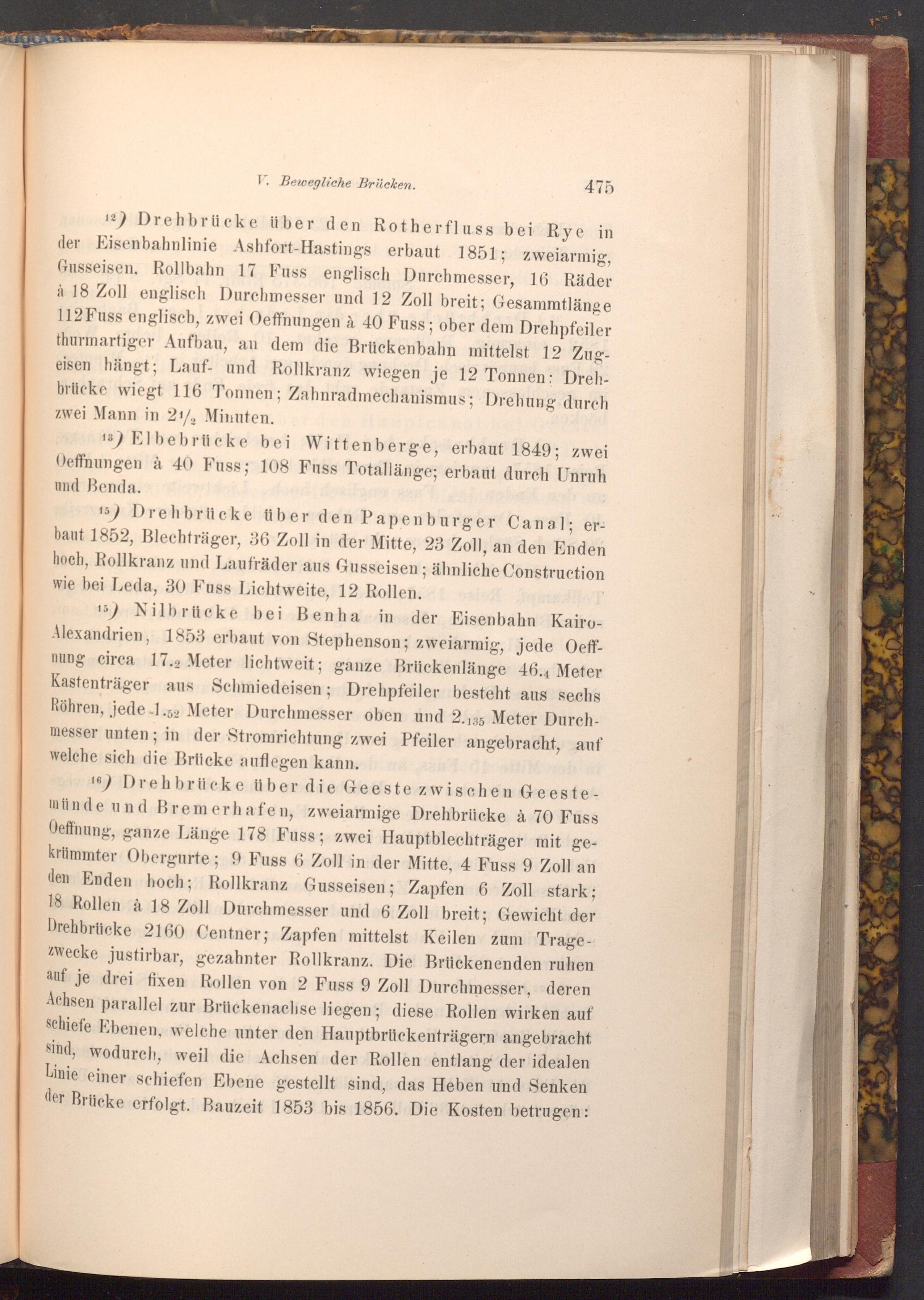 12) Drehbrücke über den Rotherfluss bei Rye in der Eisenbahnlinie Ashfort- Hastings erbaut 1851; zweiarmig, Gusseisen, Rollbahn 17 Fuss englisch Durchmesser, 16 Räder à 18 Zoll englisch Durchmesser und 12 Zoll breit; Gesammtlänge 112 Fuss englisch, zwei Oeffnungen à 40 Fuss; ober dem Drehpfeiler thurmartiger Aufbau, an dem die Brückenbahn mittelst 12 Zugeisen hängt; Lauf- und Rollkranz wiegen je 12 Tonnen: Drehbrücke wiegt 116 Tonnen; Zahnradmechanismus; Drehung durch zwei Mann in 21/2 Minuten.