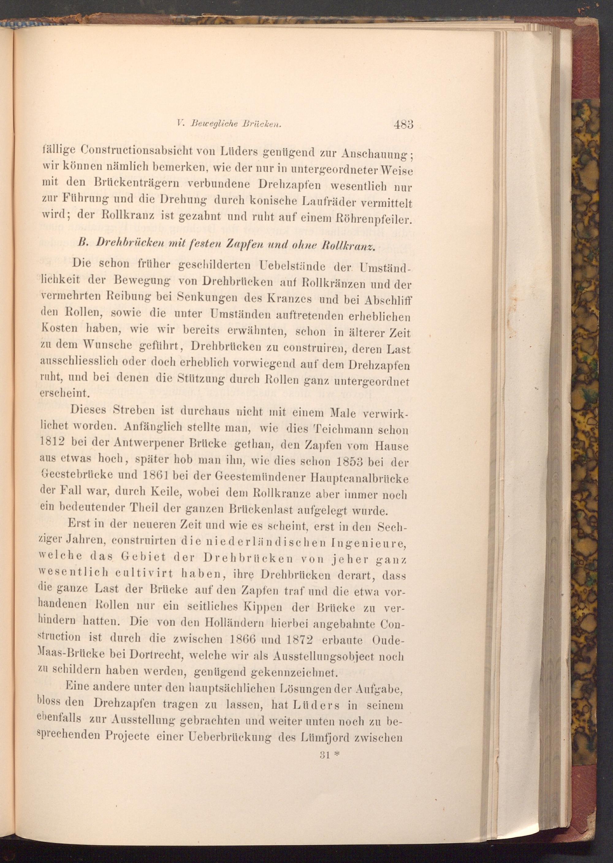 die ganze Last der Brücke auf den Zapfen traf und die etwa vorhandenen Rollen nur ein seitliches Kippen der Brücke zu verhindern hatten. Die von den Holländern hierbei angebahnte Construction ist durch die zwischen 1866 und 1872 erbaute OudeMaas- Brücke bei Dortrecht, welche wir als Ausstellungsobject noch zu schildern haben werden, genügend gekennzeichnet.