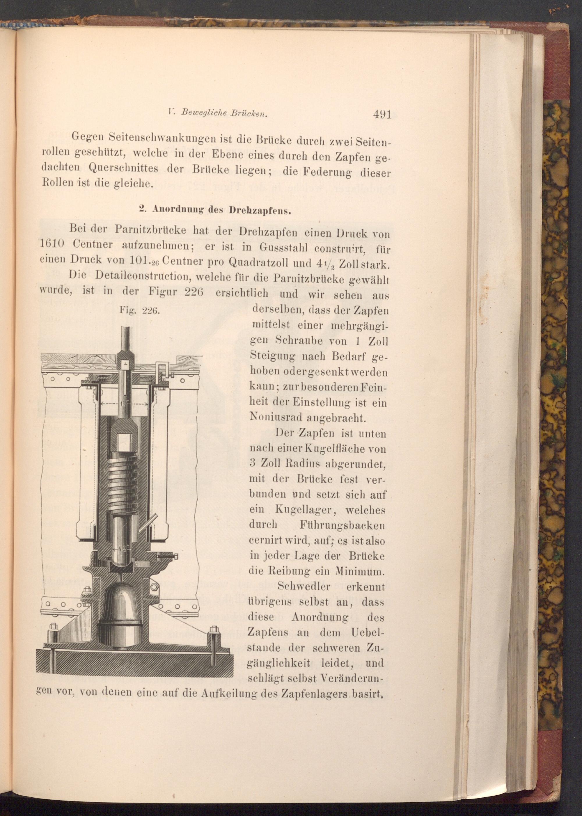 Bei der Parnitzbrücke hat der Drehzapfen einen Druck von 1610 Centner aufzunehmen; er ist in Gussstahl construirt, für einen Druck von 101.26 Centner pro Quadratzoll und 41/2 Zoll stark. Die Detailconstruction, welche für die Parnitzbrücke gewählt wurde, ist in der Figur 226 ersichtlich und wir sehen aus