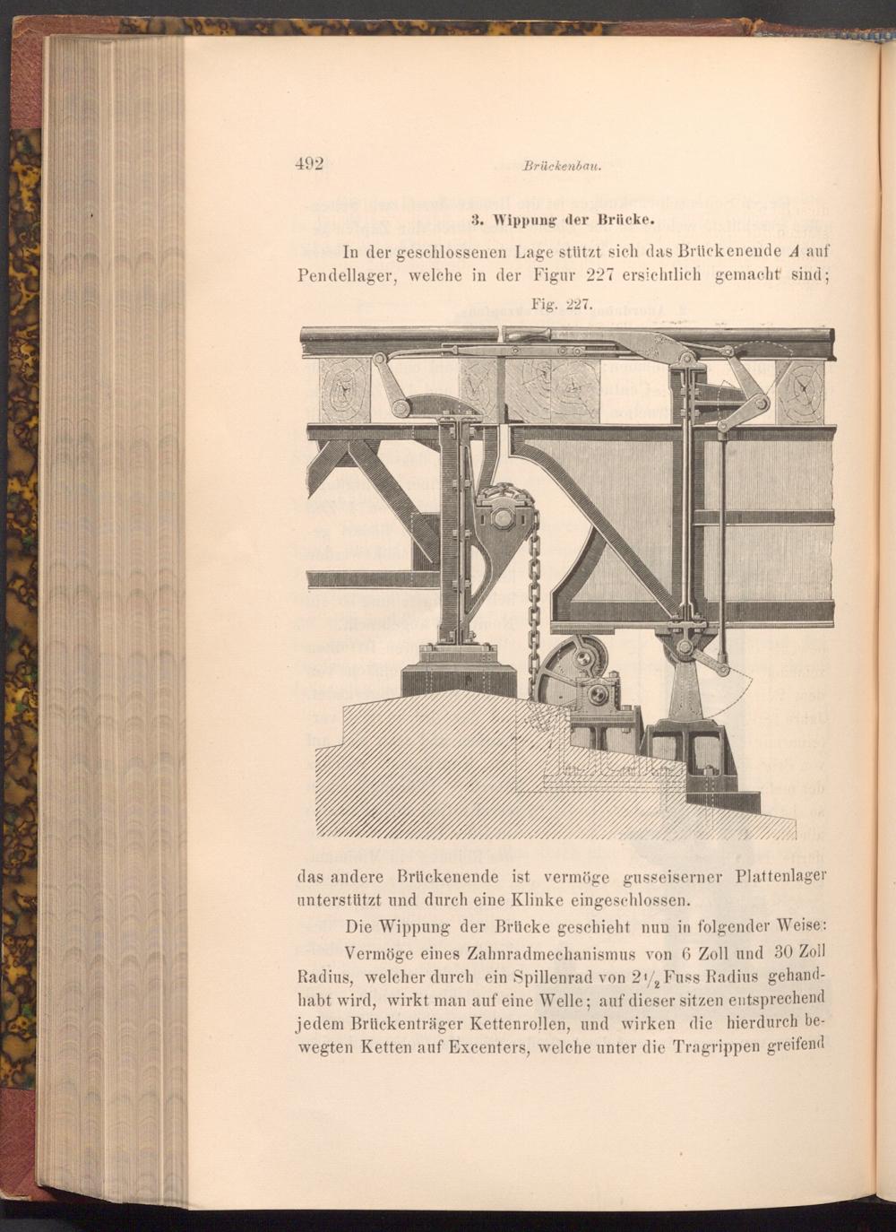 Die Wippung der Brücke geschieht nun in folgender Weise: Vermöge eines Zahnradmechanismus von 6 Zoll und 30 Zoll Radius, welcher durch ein Spillenrad von 21, Fuss Radius gehandhabt wird, wirkt man auf eine Welle; auf dieser sitzen entsprechend jedem Brückenträger Kettenrollen, und wirken die hierdurch bewegten Ketten auf Excenters, welche unter die Tragrippen greifend
