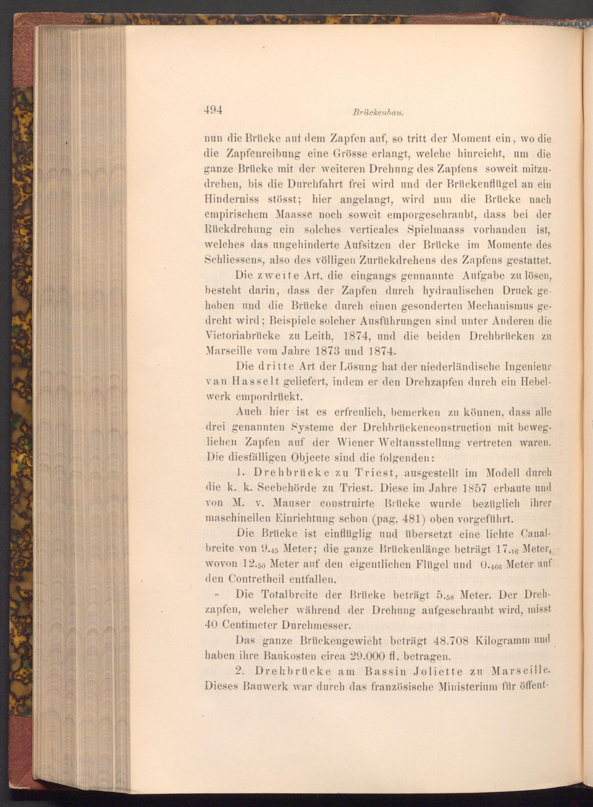 Auch hier ist es erfreulich, bemerken zu können, dass alle drei genannten Systeme der Drehbrücken construction mit beweglichen Zapfen auf der Wiener Weltausstellung vertreten waren. Die diesfälligen Objecte sind die folgenden: