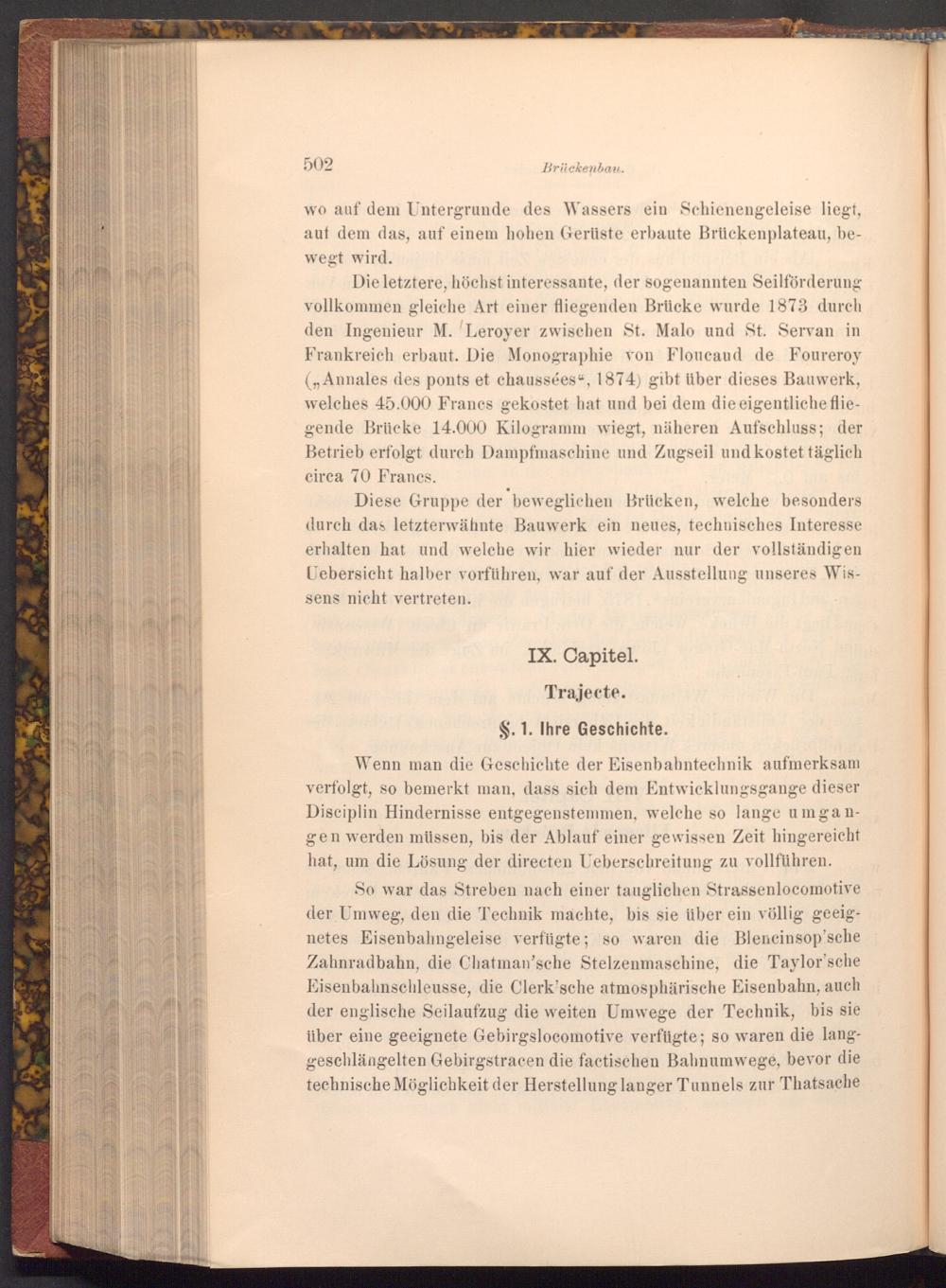 Die letztere, höchst interessante, der sogenannten Seilförderung vollkommen gleiche Art einer fliegenden Brücke wurde 1873 durch den Ingenieur M. Leroyer zwischen St. Malo und St. Servan in Frankreich erbaut. Die Monographie von Floucaud de Foureroy ( ,, Annales des ponts et chaussées", 1874) gibt über dieses Bauwerk, welches 45.000 Francs gekostet hat und bei dem die eigentliche fliegende Brücke 14.000 Kilogramm wiegt, näheren Aufschluss; der Betrieb erfolgt durch Dampfmaschine und Zugseil und kostet täglich circa 70 Francs.