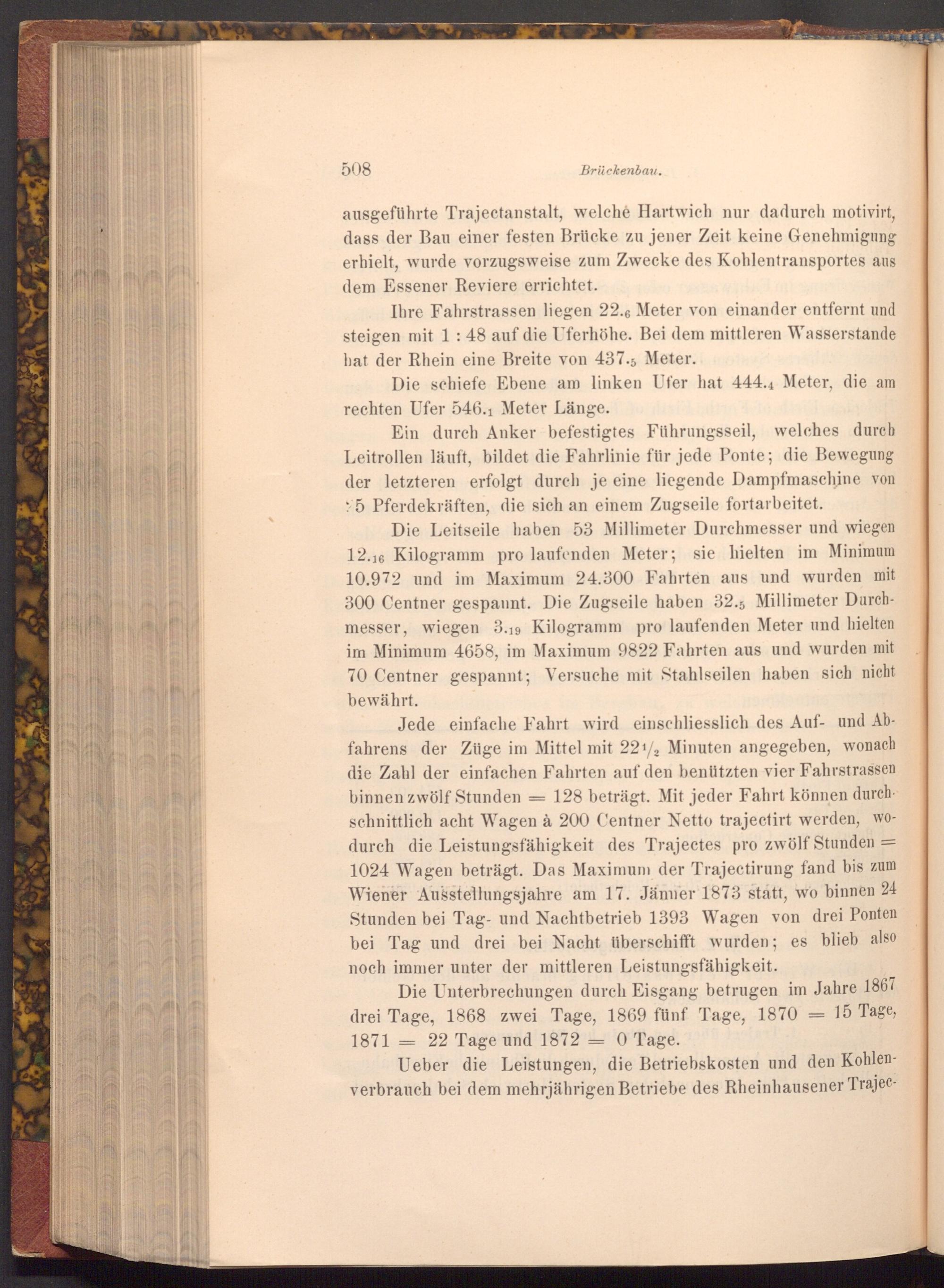 ausgeführte Trajectanstalt, welché Hartwich nur dadurch motivirt, dass der Bau einer festen Brücke zu jener Zeit keine Genehmigung erhielt, wurde vorzugsweise zum Zwecke des Kohlentransportes aus dem Essener Reviere errichtet.