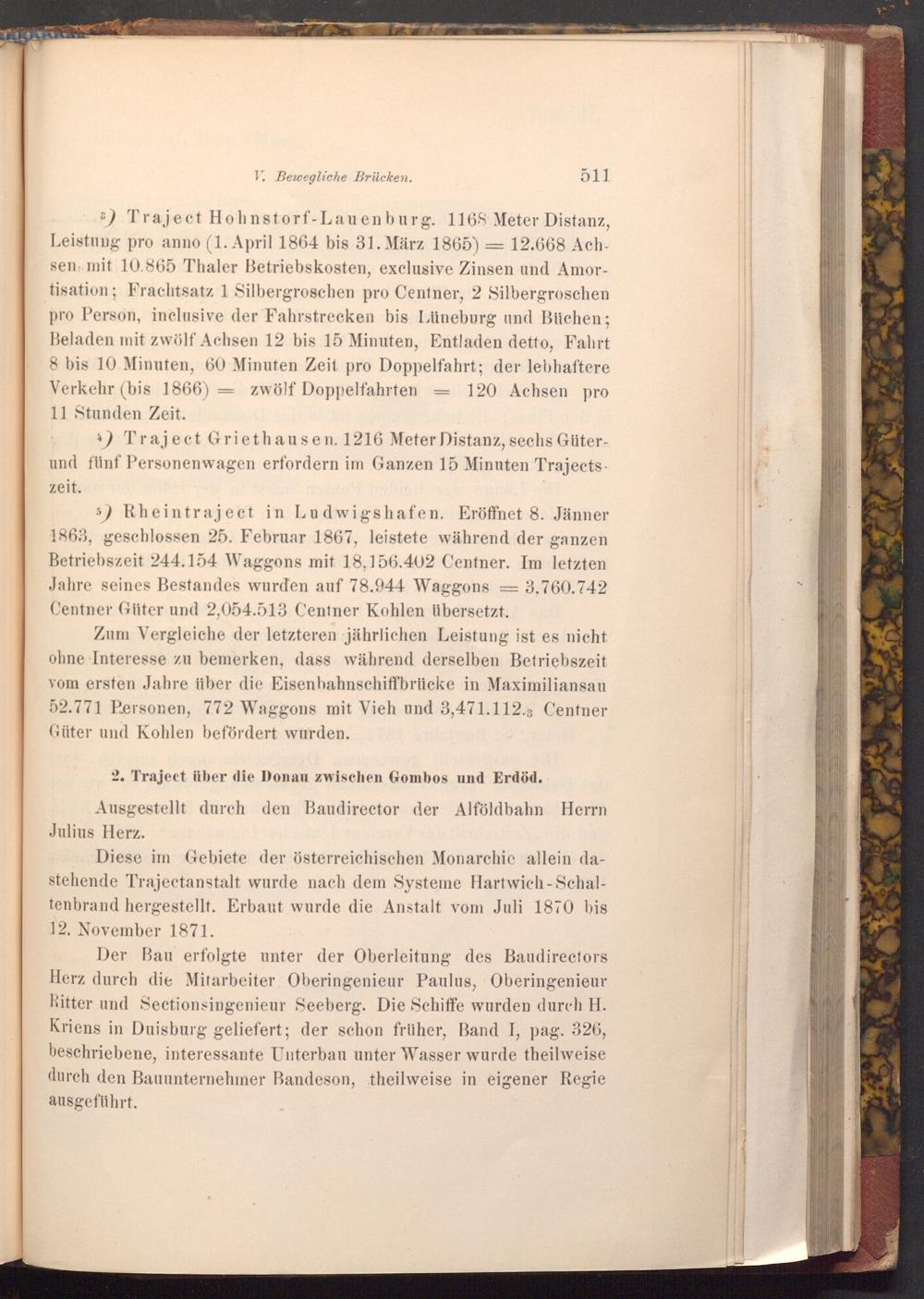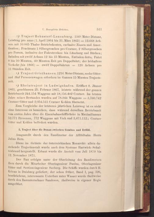 Zum Vergleiche der letzteren jährlichen Leistung ist es nicht ohne Interesse zu bemerken, dass während derselben Betriebszeit vom ersten Jahre über die Eisenbahnschiffbrücke in Maximiliansau 52.771 Personen, 772 Waggons mit Vieh und 3,471.112.3 Centner Güter und Kohlen befördert wurden.