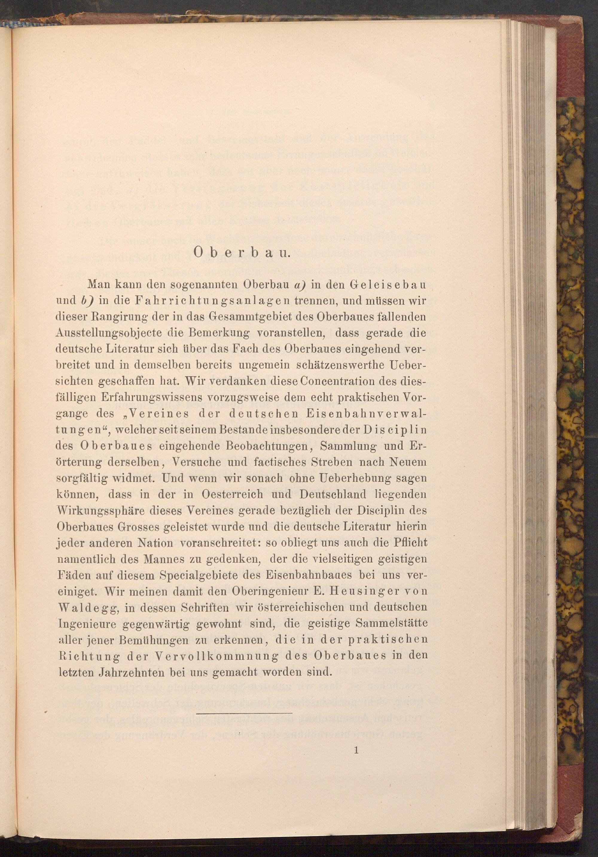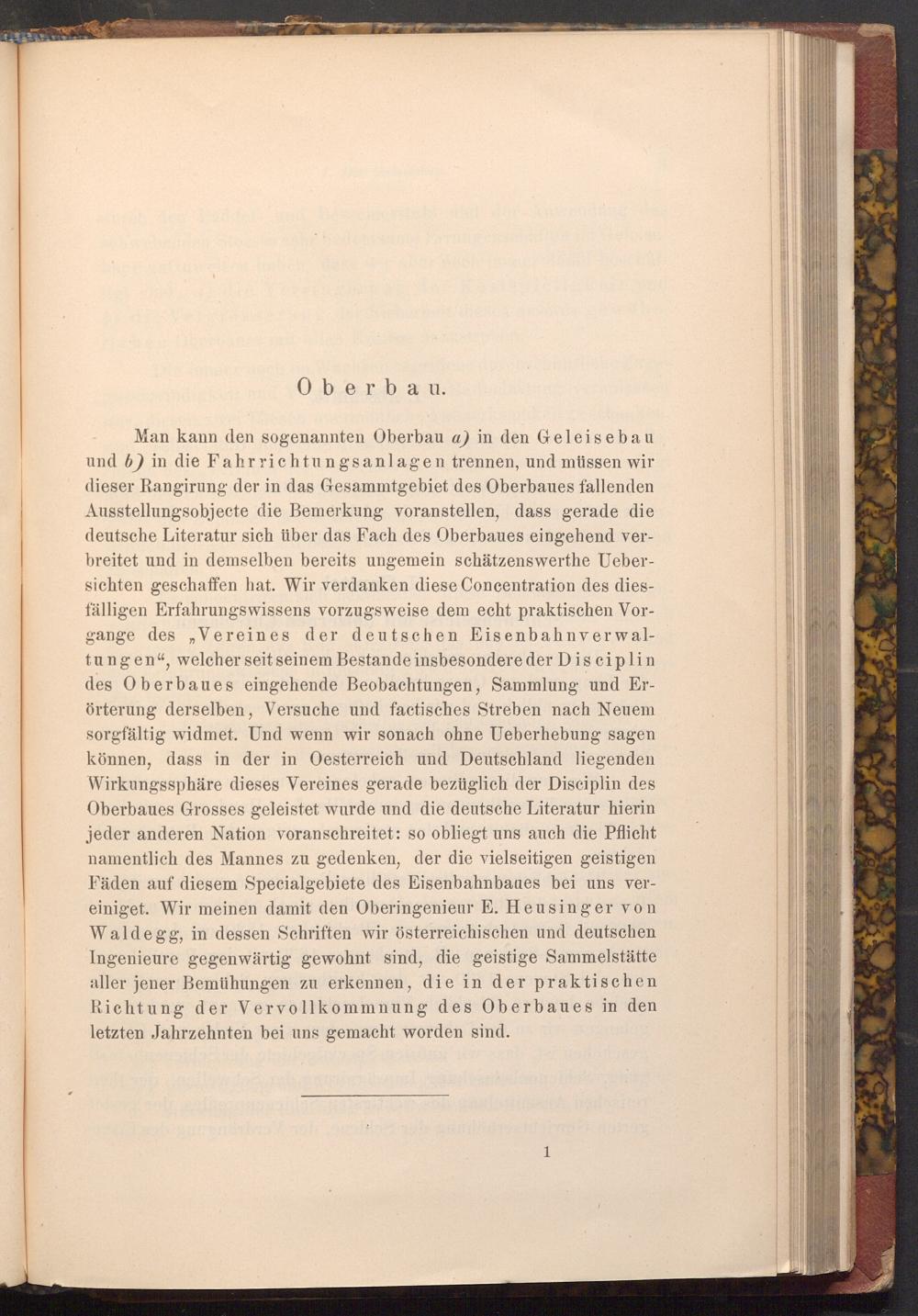 Man kann den sogenannten Oberbau a) in den Geleisebau und 6) in die Fahrrichtungsanlagen trennen, und müssen wir dieser Rangirung der in das Gesammtgebiet des Oberbaues fallenden Ausstellungsobjecte die Bemerkung voranstellen, dass gerade die deutsche Literatur sich über das Fach des Oberbaues eingehend verbreitet und in demselben bereits ungemein schätzenswerthe Uebersichten geschaffen hat. Wir verdanken diese Concentration des diesfälligen Erfahrungswissens vorzugsweise dem echt praktischen Vorgange des Vereines der deutschen Eisenbahnverwaltungen", welcher seit seinem Bestande insbesondere der Disciplin des Oberbaues eingehende Beobachtungen, Sammlung und Erörterung derselben, Versuche und factisches Streben nach Neuem sorgfältig widmet. Und wenn wir sonach ohne Ueberhebung sagen können, dass in der in Oesterreich und Deutschland liegenden Wirkungssphäre dieses Vereines gerade bezüglich der Disciplin des Oberbaues Grosses geleistet wurde und die deutsche Literatur hierin jeder anderen Nation voranschreitet: so obliegt uns auch die Pflicht namentlich des Mannes zu gedenken, der die vielseitigen geistigen Fäden auf diesem Specialgebiete des Eisenbahnbaues bei uns vereiniget. Wir meinen damit den Oberingenieur E. Heusinger von Waldegg, in dessen Schriften wir österreichischen und deutschen Ingenieure gegenwärtig gewohnt sind, die geistige Sammelstätte aller jener Bemühungen zu erkennen, die in der praktischen Richtung der Vervollkommnung des Oberbaues in den letzten Jahrzehnten bei uns gemacht worden sind.