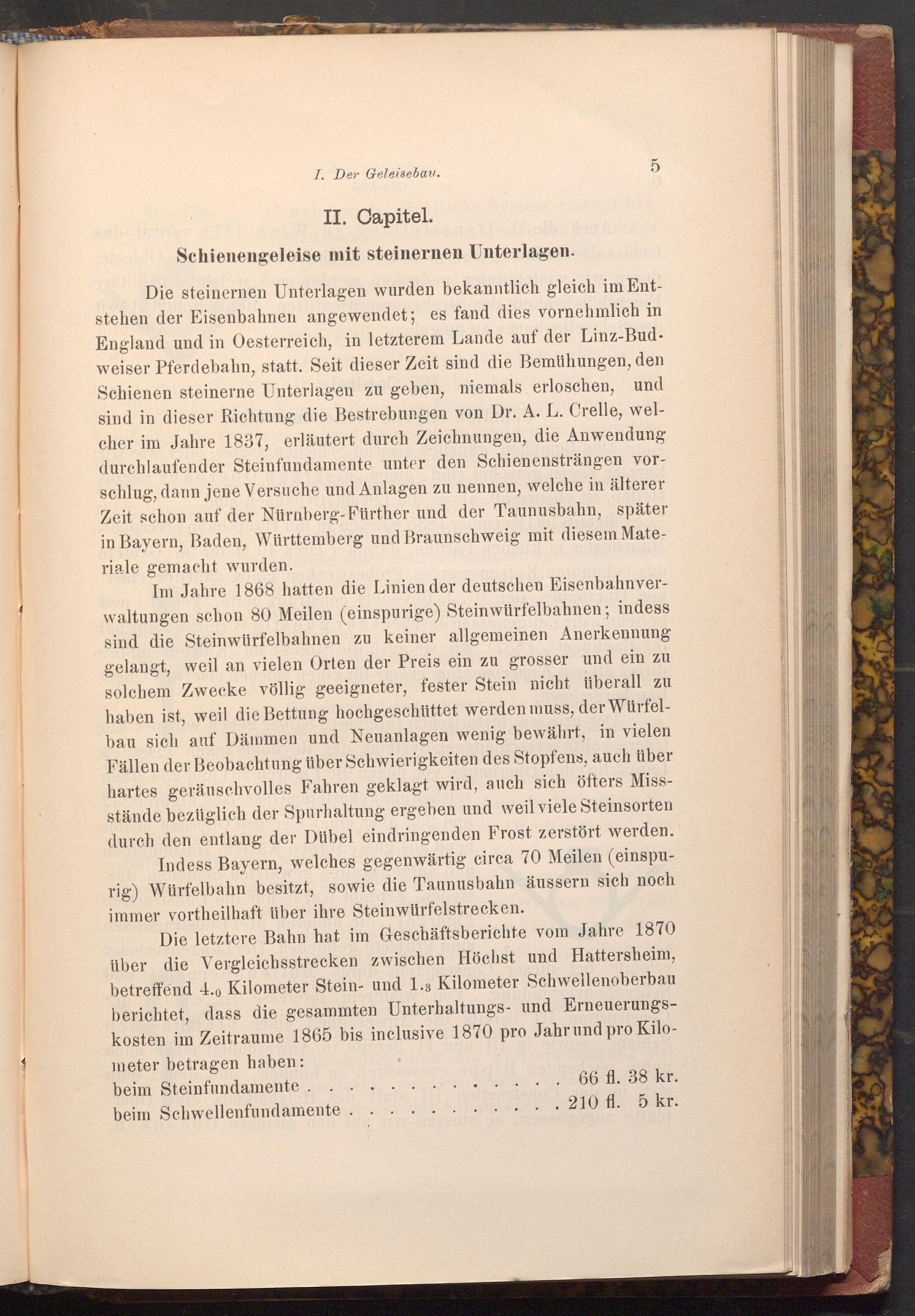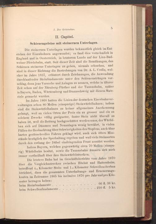 Die letztere Bahn hat im Geschäftsberichte vom Jahre 1870 über die Vergleichsstrecken zwischen Höchst und Hattersheim, betreffend 4., Kilometer Stein- und 1.3 Kilometer Schwellenoberbau berichtet, dass die gesammten Unterhaltungs- und Erneuerungskosten im Zeitraume 1865 bis inclusive 1870 pro Jahr und pro Kilometer betragen haben: