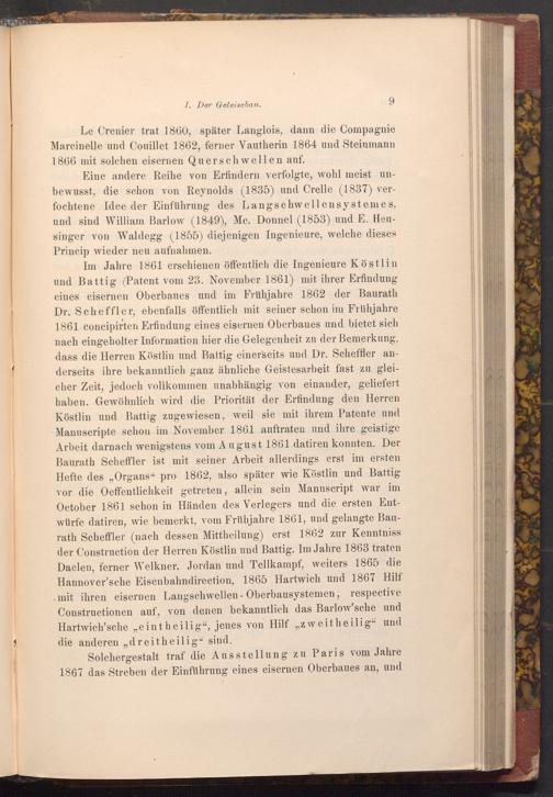 Im Jahre 1861 erschienen öffentlich die Ingenieure Köstlin und Battig( Patent vom 23. November 1861) mit ihrer Erfindung eines eisernen Oberbaues und im Frühjahre 1862 der Baurath Dr. Scheffler, ebenfalls öffentlich mit seiner schon im Frühjahre 1861 concipirten Erfindung eines eisernen Oberbaues und bietet sich nach eingeholter Information hier die Gelegenheit zu der Bemerkung, dass die Herren Köstlin und Battig einerseits und Dr. Scheffler anderseits ihre bekanntlich ganz ähnliche Geistesarbeit fast zu gleicher Zeit, jedoch vollkommen unabhängig von einander, geliefert haben. Gewöhnlich wird die Priorität der Erfindung den Herren Köstlin und Battig zugewiesen, weil sie mit ihrem Patente und Manuscripte schon im November 1861 auftraten und ihre geistige Arbeit darnach wenigstens vom August 1861 datiren konnten. Der Baurath Scheffler ist mit seiner Arbeit allerdings erst im ersten Hefte des„ Organs" pro 1862, also später wie Köstlin und Battig vor die Oeffentlichkeit getreten, allein sein Manuscript war im October 1861 schon in Händen des Verlegers und die ersten Entwürfe datiren, wie bemerkt, vom Frühjahre 1861, und gelangte Baurath Scheffler( nach dessen Mittheilung) erst 1862 zur Kenntniss der Construction der Herren Köstlin und Battig. Im Jahre 1863 traten Daelen, ferner Welkner, Jordan und Tellkampf, weiters 1865 die Hannover'sche Eisenbahndirection, 1865 Hartwich und 1867 Hilf mit ihren eisernen Langschwellen- Oberbausystemen, respective Constructionen auf, von denen bekanntlich das Barlow'sche und Hartwich'sche„ eint heilig", jenes von Hilf zweit heilig" und die anderen ,, dreitheilig" sind.